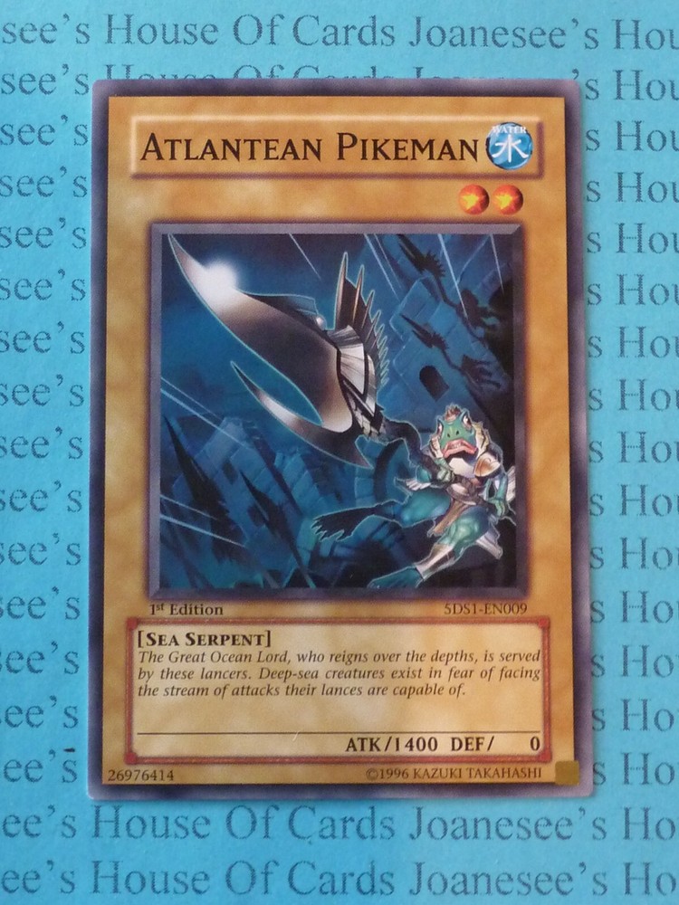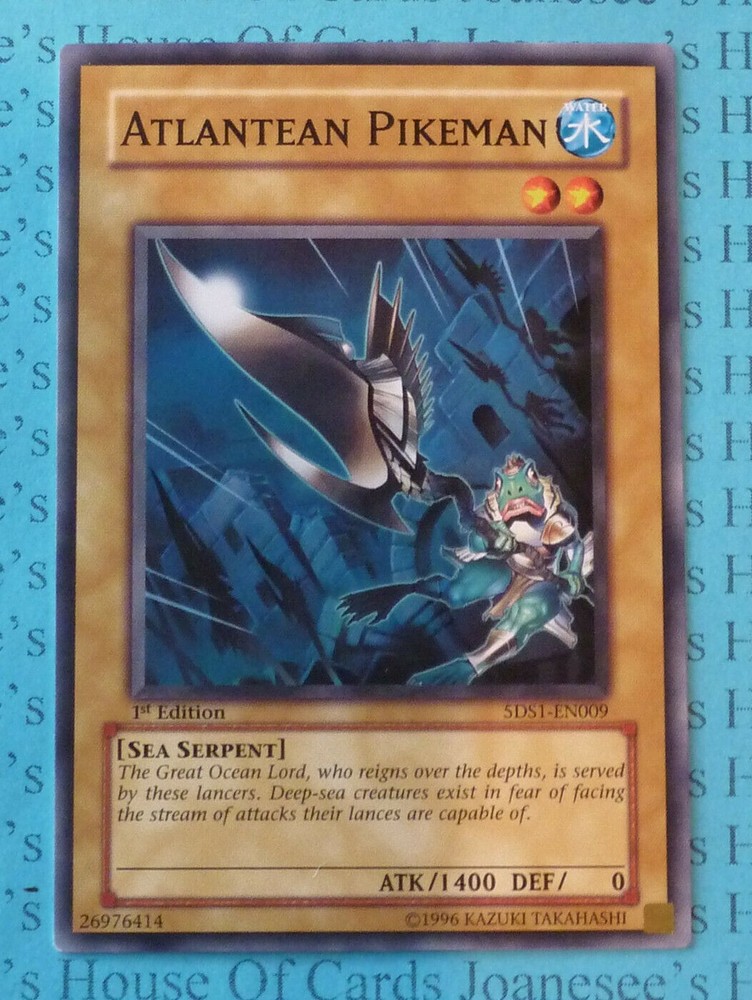 This is a Common Water Sea Serpent Atlantean Pikeman 2 Stars ATK/1400 DEF/0 Card text: The Great Ocean Lord, who reigns over the depths, is served by these lancers. Deep-sea creatures exist in fear of facing the stream of attacks their lances are capable of. 5DS1 -EN009 1st Edition English Mint Condition Totally Original Konami (or your money back!) I will deliver in safe packaging to keep it in perfect condition. Ideal for players and collectors alike. Check out my other items! I will combine postage costs for multiple purchases. Sign up for my email newsletters by adding my eBay Shop to your favourites