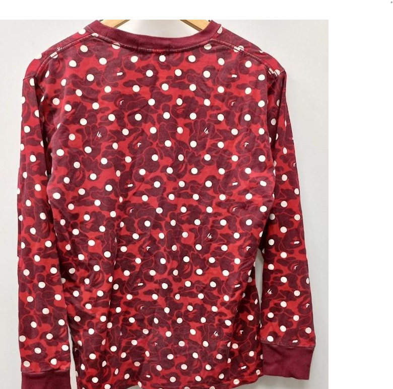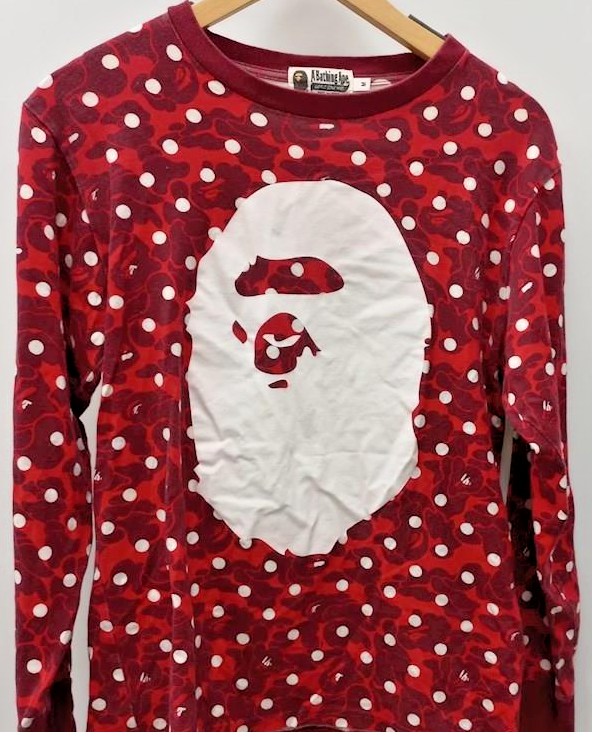 Unleash your style with this BAPE A Bathing Ape T-Shirt, a true blend of comfort and avant-garde aesthetics. Crafted in Japan, this red jersey tee features a bold graphic print that's jam-packed with characters from various pop culture realms, including DC Universe and Tokyo Ghoul. It's designed for a regular fit and suitable for all seasons, making it a versatile choice for your wardrobe. The shirt's long sleeves and classic crew neck provide a timeless look, while the subtle logo accents add a touch of brand prestige. Made from premium cotton, it’s easy to care for and perfect for any casual outing. Embrace the unique blend of outdoor themes and urban style that this piece offers. Measurements - 24 inches Long Armpit to Armpit is 20 inches