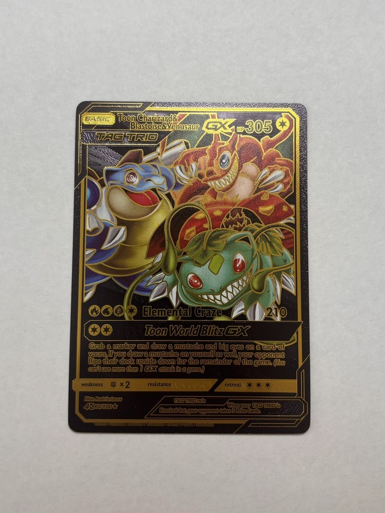 This amazing black foil card collection features some of the most iconic characters from the Toon Charizard & Blastoise & Venusaur GX NM set. With a colorless attribute and GX speciality, this card is a must-have for any avid collector or fan of the Card Game. The card is made of high-quality plastic and has a full art design with a stunning foil finish. The card features Venusaur, one of the most beloved characters in the set, with an HP of 300 and an attack power of 210. It is perfect for display or for use in gameplay, and is sure to impress anyone who sees it. The card is in English and is suitable for ages 6 and up. Don't miss out on the chance to add this incredible card to your collection!