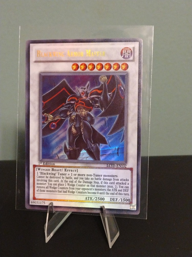 This is a rare and highly sought-after Blackwing Armor Master card from the Legendary Collection 5D's set of the Yu-Gi-Oh! TCG. The card features a Winged Beast creature type with a Dark color attribute and a rarity of Secret Rare. It has an Effect card type with a card number of LC5D-EN132 and is manufactured by Konami. The card is 1st Edition and has a defense/toughness of 1500 and an attack/power of 2500. It is suitable for ages 4 and up and is in English. Shipped via eBay standard envelope