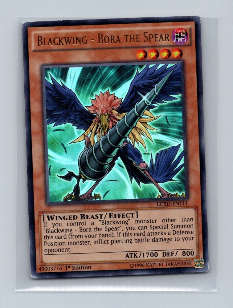 What is pictured is what is being sold, feel free to ask any questions. Item is in condition described in title. ALL CARDS ARE SCANNED WITH DOCUMENT SCANNER, ANY LINES THROUGH CARDS ARE FROM SCANNER NOT ON ACTUAL CARDS. document scanners show any imperfections in holos better than normal pictures so please be aware of that! Will be shipped in top loader. Make offer! Thanks for looking!!! Also, there is Discounted shipping and final price on multipule purchases from the store! The Blackwing - Bora the Spear LC5D-EN111 1st Edition Ultra Rare card is a powerful Yu-Gi-Oh! TCG collectible from the Legendary Collection 5D's set. This Dark attribute card features a Winged Beast type creature with a high Defense/Toughness of 800 and an impressive Attack/Power of 1700. Manufactured by Konami, this English language card is a sought-after addition for collectors and players alike. Ideal for fans of Yu-Gi-Oh! looking to enhance their deck with a rare and potent card like Bora the Spear.
