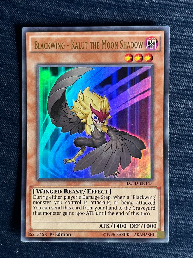 What is pictured is what is being sold, feel free to ask any questions. Item is in condition described in title. ALL CARDS ARE SCANNED WITH DOCUMENT SCANNER, ANY LINES THROUGH CARDS ARE FROM SCANNER NOT ON ACTUAL CARDS. document scanners show any imperfections in holos better than normal pictures so please be aware of that! Will be shipped in top loader. Make offer! Thanks for looking!!! Also, there is Discounted shipping and final price on multipule purchases from the store! The Blackwing - Kalut the Moon Shadow LC5D-EN115 card from Yu-Gi-Oh! TCG is an ultra rare, 1st edition collectible featuring a dark winged beast creature type with high attack power and defense toughness. Manufactured by Konami on sturdy card stock material, this English-language card is a sought-after addition for collectors and players of the Yu-Gi-Oh! trading card game. With its unique features and attributes, this card is a valuable and sought-after item for fans of the game.