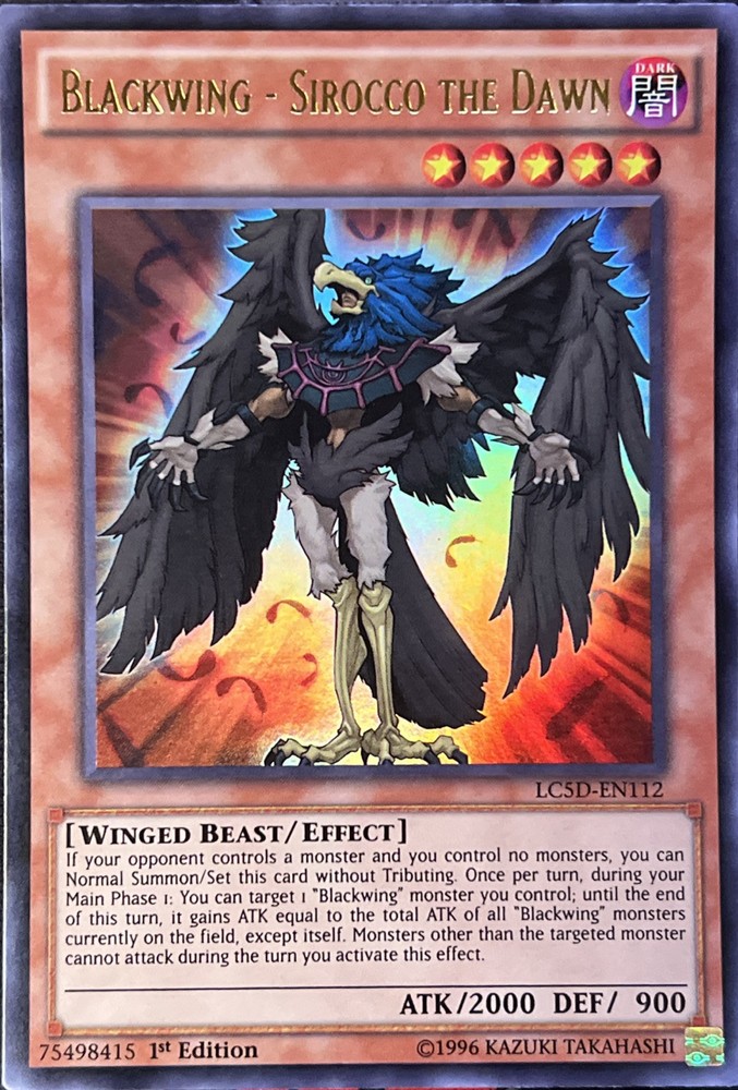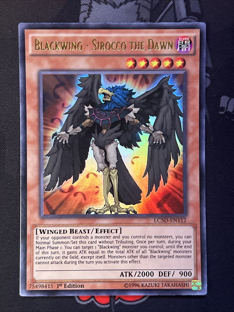 The product is a Yu-Gi-Oh! TCG card called "Blackwing - Sirocco the Dawn" from the Legendary Collection 5D's set. It is an Ultra Rare card with the card number LC5D-EN112 and features the Winged Beast creature type with a Dark attribute. This 1st Edition card has an Attack/Power of 2000 and a Defense/Toughness of 900, making it a powerful addition to a card collection for fans of the game. It is in English language and manufactured by Konami.