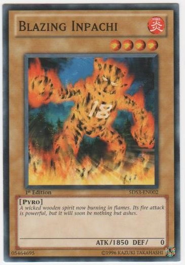 Blazing Inpachi - 5DS3-EN002 - Common - 1st Edition Image is a stock photo of the card. You will receive the card in Near Mint condition Condition: Near Mint ATK/DEF : 1850/0 Attribute : Fire Card Number : 5DS3-EN002 Card Rules : No Rulings Available for this card Card Text : Card Type : Normal Monster Edition : 1st Level : 4 Monster Type : Pyro Name : Blazing Inpachi Passcode : 05464695 Rarity : Common Set : Starter Deck: Duelist Tollbox Be sure to visit our store for a wide selection of your favorite cards! We are running specials RIGHT NOW!! Shipping Options: ~Ships in a regular white envelope with a stamp for FREE! (THERE IS NO TRACKING INFORMATION AVAILABLE FOR THE ABOVE METHOD. SHIPPING TIME IS 4-10 BUSINESS DAYS) ~Ships in a TRACKEDbubble mailer for $5.99! ~Shipments are handled same or next business day. ~FREE SHIPPING for each additional card, so shop around our store!