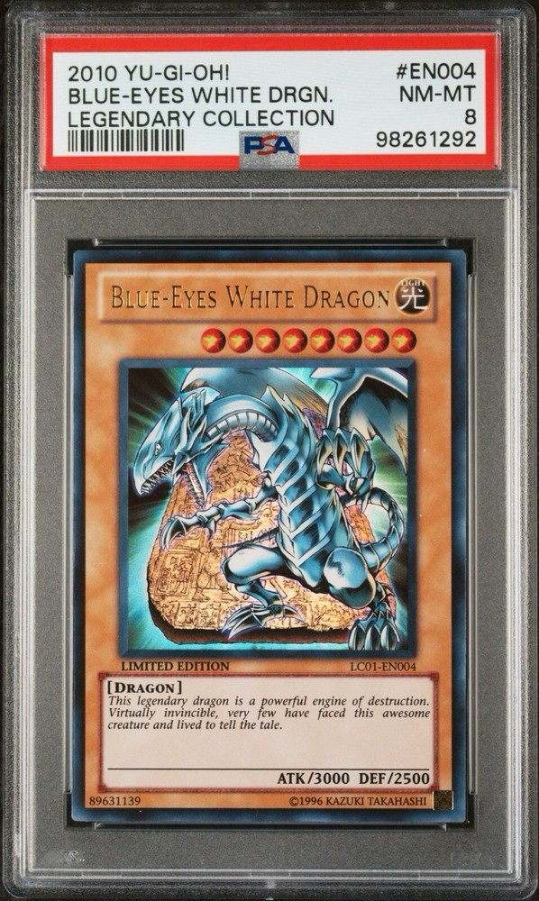 The Blue-Eyes White Dragon is a Dragon-type creature card from the Yu-Gi-Oh Legendary Collection 1. It has 3000 Attack and 2500 Defense points, making it a powerful card in the Yu-Gi-Oh! TCG. This Limited Edition Ultra Rare card is in English and manufactured by Konami with card number LC01-EN004.