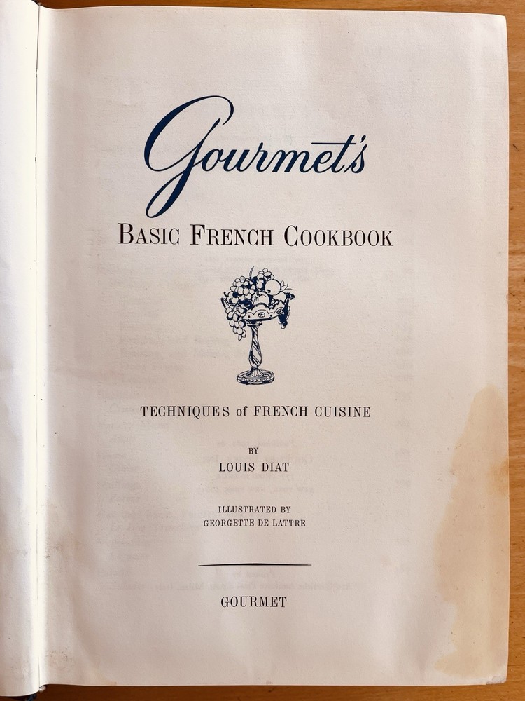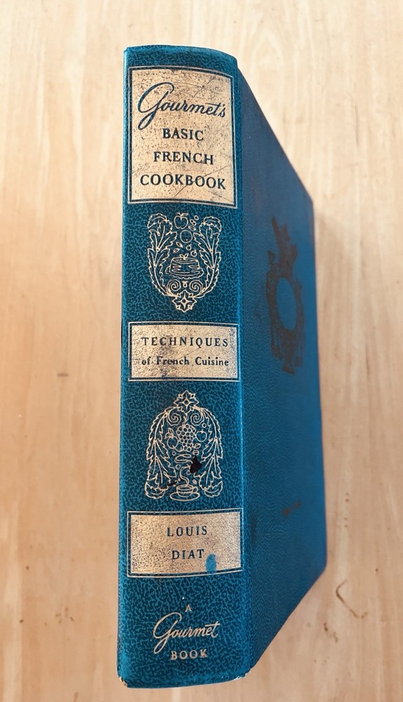 The "Basic French Cookbook: Techniques of French Cuisine" by Louis Diat is a vintage hardcover cookbook published in 1968 by Gourmet. Printed in Italy.