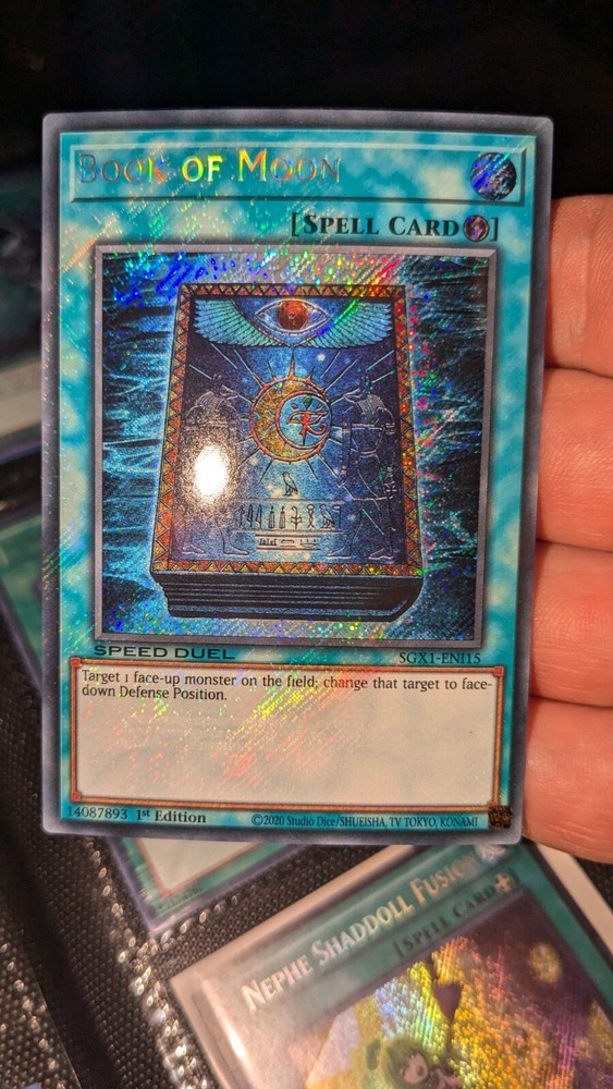 This is a Secret Rare card named "Book of Moon" from the Yu-Gi-Oh! TCG Speed Duel GX: Duel Academy Box. It is a Spell-Normal card with the card number SGX1-ENI15. The card features a 1st Edition and has a GX speciality. The card is in English and was manufactured by Konami. The card's attribute/MTG color is Spell.