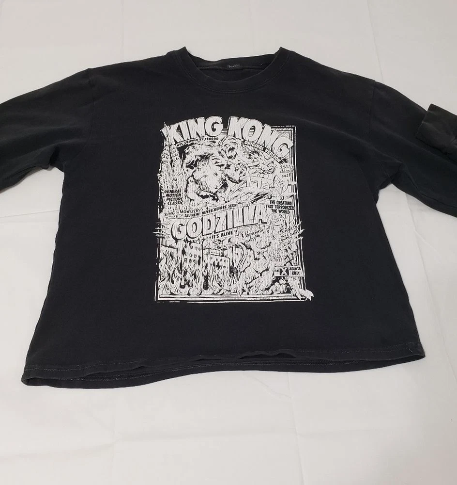 Brandy Melville John Galt Large Black Women's t-shirt featuring a King Kong and Godzilla graphic design. Perfect for casual wear. Size tag is missing please review measurements