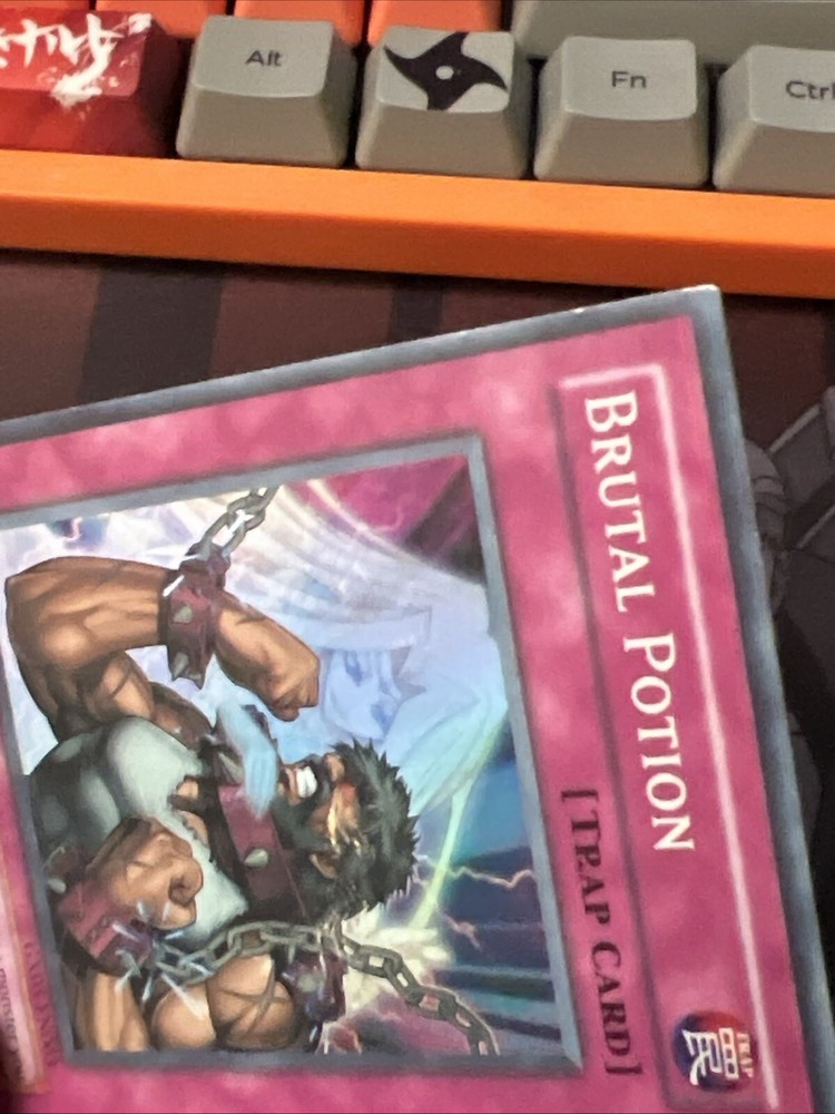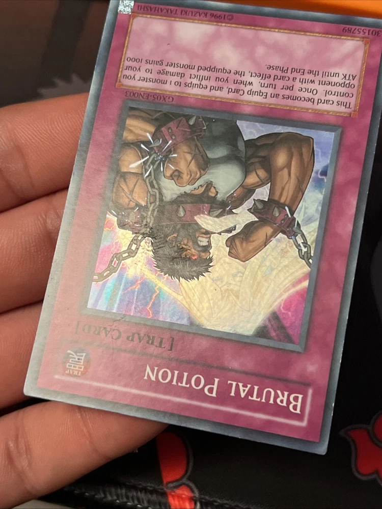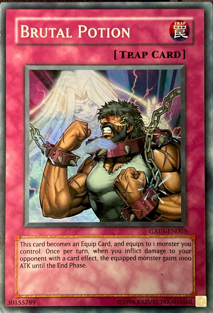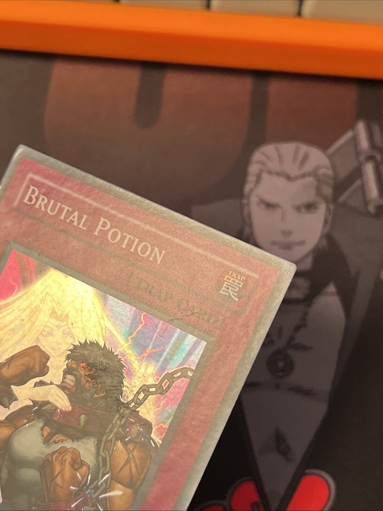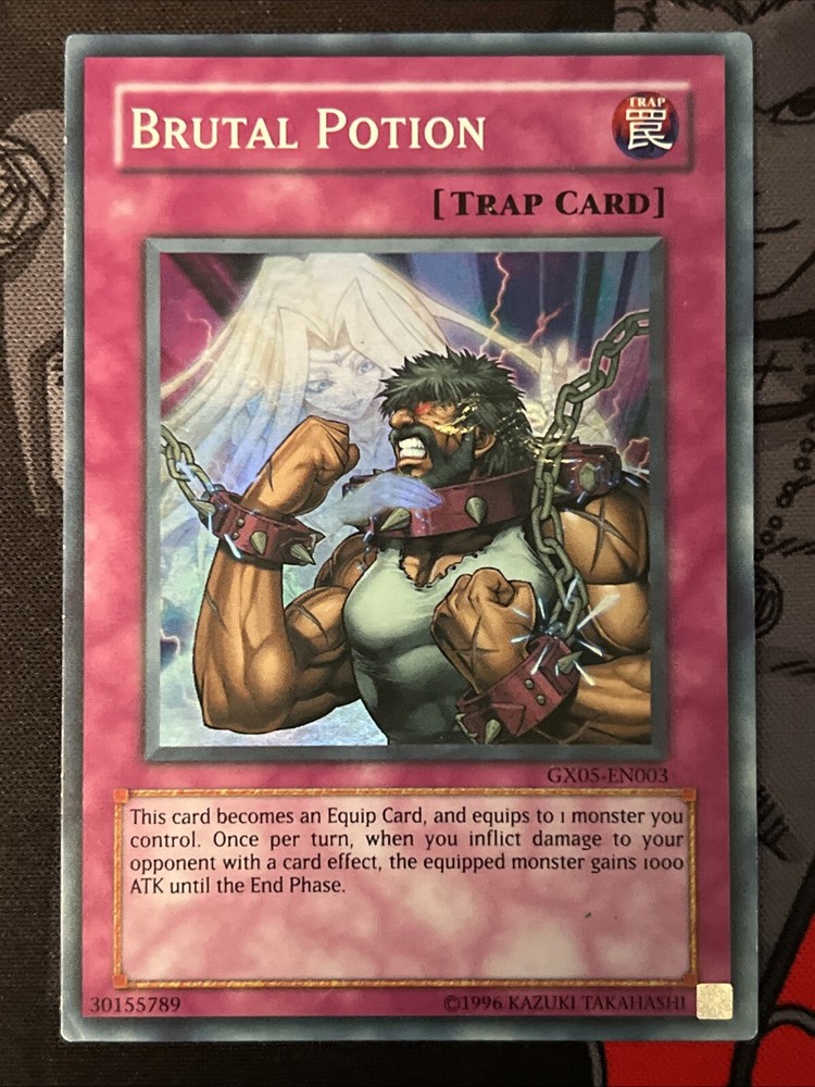 The "Brutal Potion" card is a Limited Edition Super Rare Trap card from the Yu-Gi-Oh! GX Tag ForceEvolution Promotional Cards Promo set. Manufactured by Konami, this English language card is part of the Yu-Gi-Oh! TCG game and specifically designed for GX gameplay. With card number GX05-EN003, it features a Normal Trap card type and is considered a valuable collectible in the CCG Individual Cards category for enthusiasts of the game.