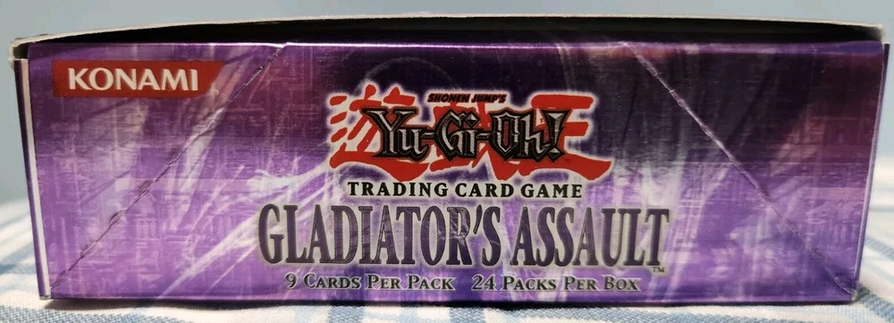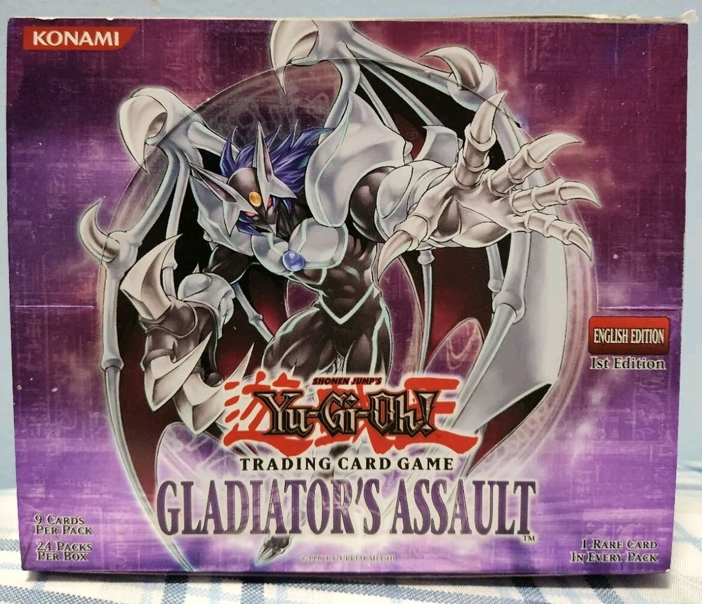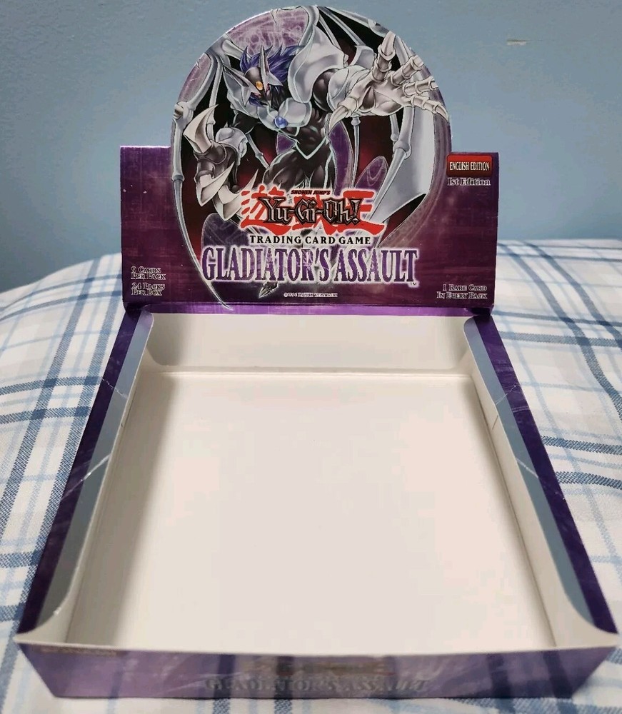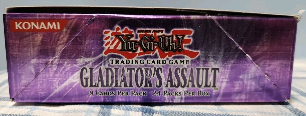 You'll receive the exact box in the title and photos. Box has some dents and creases due to age and storage. Still in good condition. If you have any questions or concerns, just DM me. Also, check out my other listing for more empty boxes. Also, follow me on IG @lobhunter for more deals This is an empty card box from the Yu-Gi-Oh! GX 1st Edition Gladiators Assualt set. It features the character Box and is in English language. The packaging type is an empty card box, and it was manufactured by Konami in 2006. This item is perfect for collectors of non-sport trading cards or fans of the Yu-Gi-Oh! franchise and TV show.