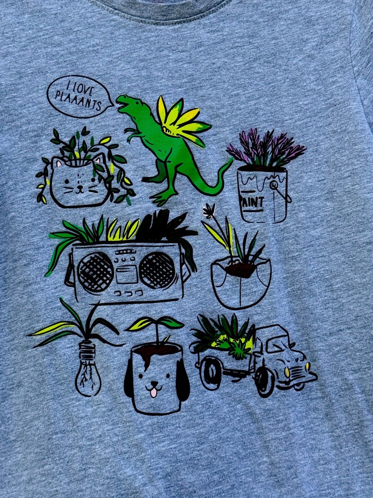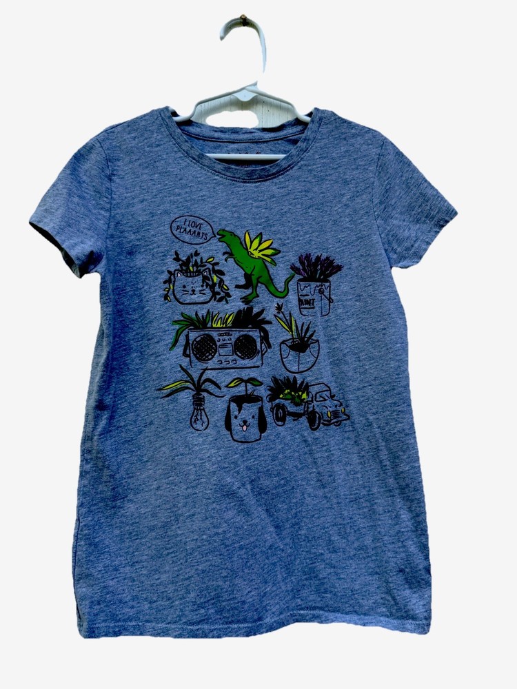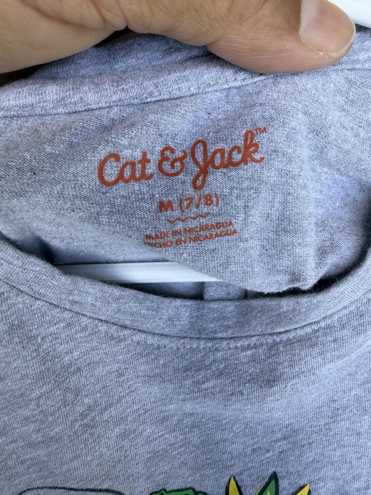 The Cat And Jack Kids T Shirt Graffic in size M (7-8) is a stylish pullover shirt featuring a crew neck and short sleeves, perfect for casual occasions like travel and activewear. Made from a comfortable cotton blend fabric, this gray shirt showcases a fun dinosaur print, adding a playful touch to any outfit. With its all-season design, this shirt is ideal for summer adventures and can be easily cared for with machine washing. Perfect for boys who love dinosaurs and want to stand out in their everyday look.