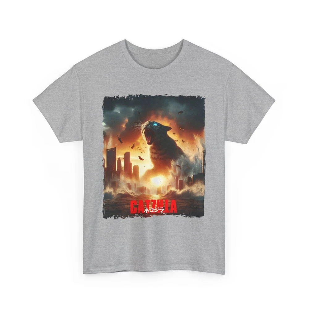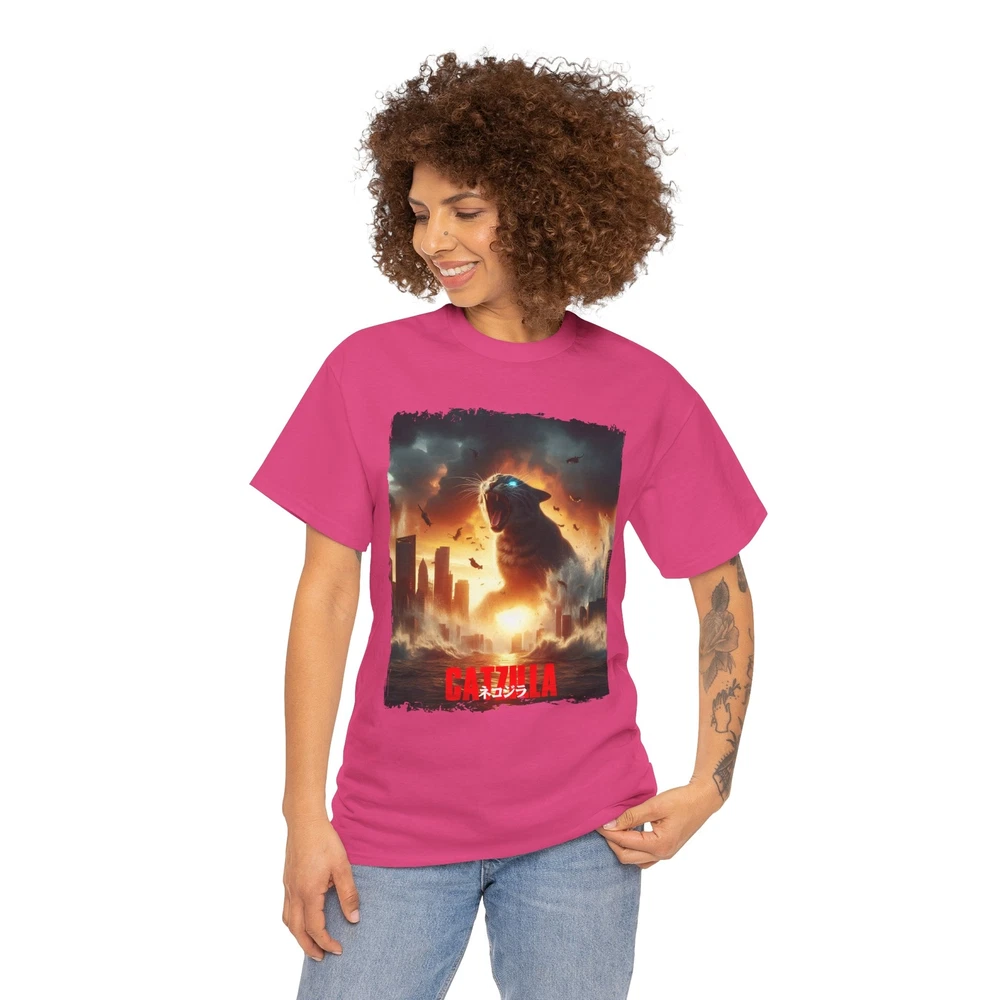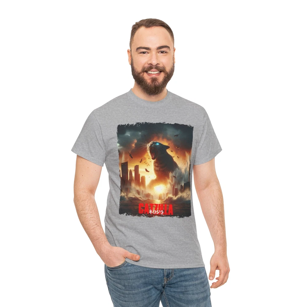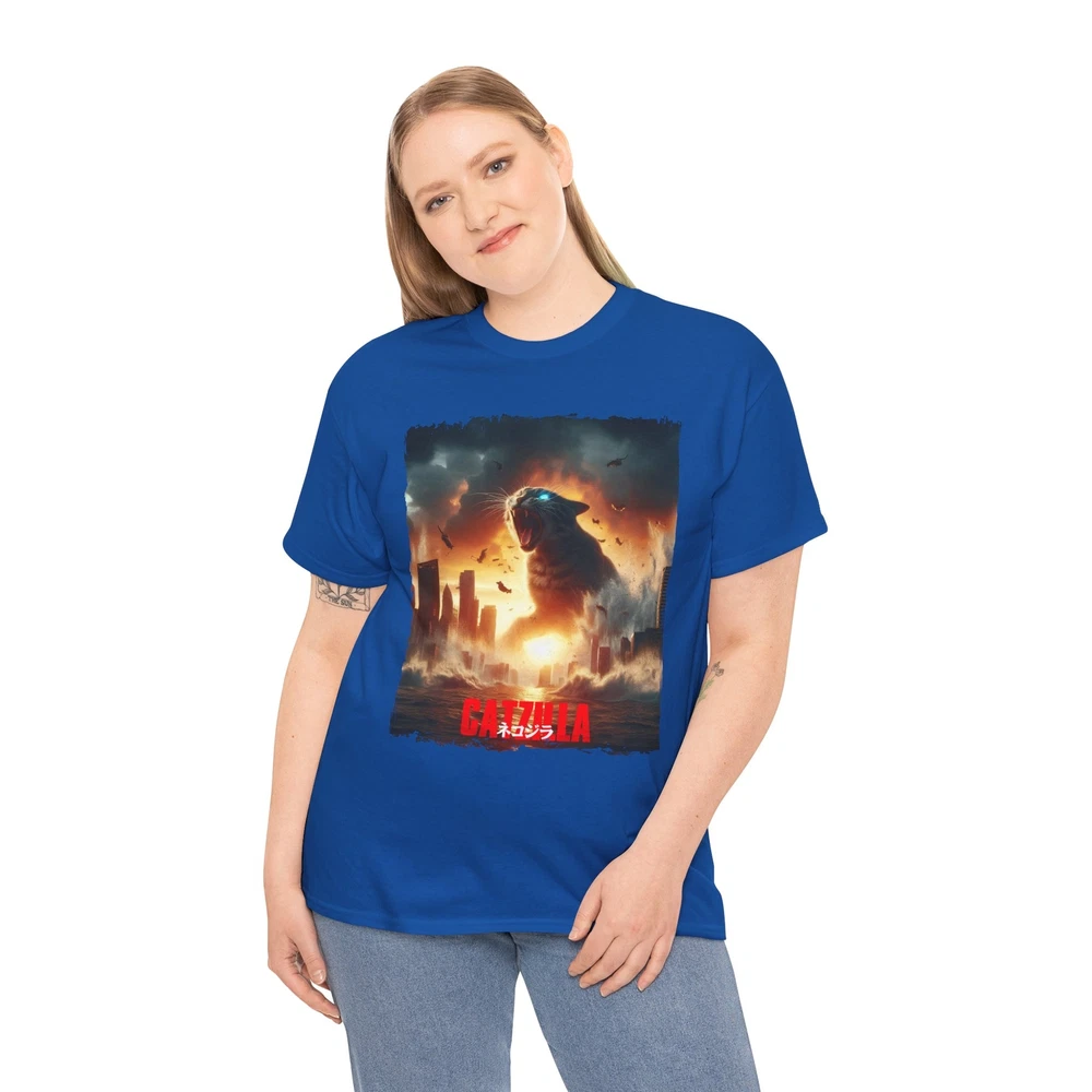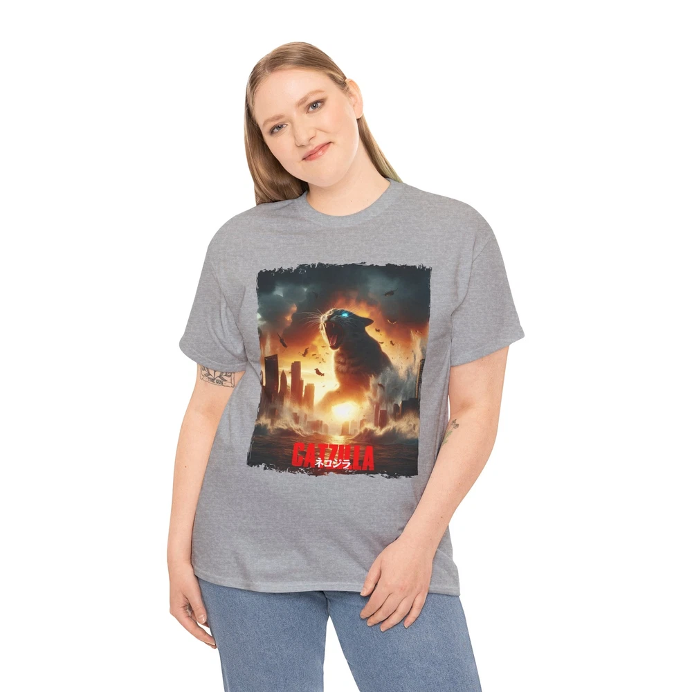IMPERIAL S M L XL 2XL 3XL 4XL 5XL Width, in 18.00 20.00 22.00 24.00 26.00 28.00 30.00 32.00 Length, in 28.00 29.00 30.00 31.00 32.00 33.00 34.00 35.00 Sleeve length (from center back), in 15.10 16.50 18.00 19.50 21.00 22.40 23.70 25.00 Size tolerance, in 1.50 1.50 1.50 1.50 1.50 1.50 1.50 1.50 ------------------------------------------------------------------------------------------------------------------------------------------------------------------------------ METRIC S M L XL 2XL 3XL 4XL 5XL Width, cm 45.72 50.80 55.88 60.96 66.04 71.12 76.20 81.28 Length, cm 71.12 73.66 76.20 78.74 81.28 83.82 86.36 88.90 Sleeve length (from center back), cm 38.35 41.91 45.72 49.53 53.34 56.90 60.20 63.50 Size tolerance, cm 3.81 3.81 3.81 3.81 3.81 3.81 3.81 3.81 ----------------------------------------------------------------------------------------------------------------------------------------------------------------------------- Unleash feline chaos in style with our Catzilla T-Shirt , the ultimate tee for cat lovers who adore epic, funny, and monster-sized designs. Whether you're a fan of urban legends, Japanese kaiju culture, or just love a sassy cat with a giant attitude, this shirt is made for you. Crafted from 100% ethically grown U.S. cotton, this tee offers a durable yet soft medium-weight fabric (5.3 oz/yd² / 180 g/m²) that feels great on the skin and lasts wear after wear. Its classic fit ensures all-day comfort, while the crew neckline delivers a clean, timeless look perfect for both casual hangouts and relaxed weekends. Designed for cat lovers , kaiju fans , and anyone who enjoys bold, funny, and creative graphic tees, this shirt is more than just a novelty ? it's a wardrobe essential. The tear-away label guarantees a scratch-free experience with no irritation, and its Oeko-Tex certification means it's been tested for harmful substances, ensuring safety and peace of mind. Whether you're buying it for yourself or as a gift for a fellow cat fan, our Catzilla tee brings comfort, laughs, and style together in one perfect package. The unisex heavy cotton tee is the basic staple of any wardrobe. It is the foundation upon which casual fashion grows. All it needs is a personalized design to elevate things to profitability. The specially spun fibers provide a smooth surface for premium printing vividity and sharpness. No side seams mean there are no itchy interruptions under the arms. The shoulders have tape for improved durability. .: Made with medium fabric (5.3 oz/yd² (180 g/m²)) consisting of 100% cotton for year-round comfort that is sustainable and highly durable. .: The classic fit of this shirt ensures a comfy, relaxed wear while the crew neckline adds that neat, timeless look that can blend into any occasion, casual or semi-formal. .: The tear-away label means a scratch-free experience with no irritation or discomfort whatsoever. .: Made using 100% US cotton that is ethically grown and harvested. Gildan is also a proud member of the US Cotton Trust Protocol ensuring ethical and sustainable means of production. This blank tee is certified by Oeko-Tex for safety and quality assurance. The classic fit ensures a comfy, relaxed wear, while the crew neckline adds a neat, timeless look suitable for any occasion, casual or semi-formal. The tear-away label provide a scratch-free experience, ensuring no irritation or discomfort. Key Features: - **Shoulder Tape**: Twill tape covers the shoulder seams to stabilize the back of the garment and prevent stretching. - **No Side Seams**: Knitted in one piece using tubular knit, reducing fabric waste and making the garment more attractive. - **Ribbed Knit Collar**: Highly elastic ribbed knit collar helps retain its shape. - **Durable Fabric**: Specially spun fibers create a smooth surface for premium printing vividity and sharpness. Care Instructions: - Machine wash: warm (max 40C or 105F) - Non-chlorine bleach as needed - Tumble dry: medium - Do not iron - Do not dry clean This unisex heavy cotton tee is the foundation of casual fashion, providing a smooth surface for vibrant and sharp prints. Made from ethically grown and harvested cotton. EU representative : Invicticonte LLC, 2105 Vista Oeste St NW Suite E 1187, Albuquerque, NM, 87120, US Product information : Gildan 5000, 2 year warranty in EU and Northern Ireland as per Directive 1999/44/EC Warnings, Hazard : For adults, Made in Nicaragua Care instructions : Machine wash: warm (max 40C or 105F), Non-chlorine: bleach as needed, Tumble dry: medium, Do not iron, Do not dryclean Keywords: catzilla t-shirt, funny cat shirt, kaiju cat tee, cat graphic t-shirt, monster cat shirt, cat lovers gift, Japanese inspired shirt, cotton t-shirt USA, giant cat tee, urban cat design