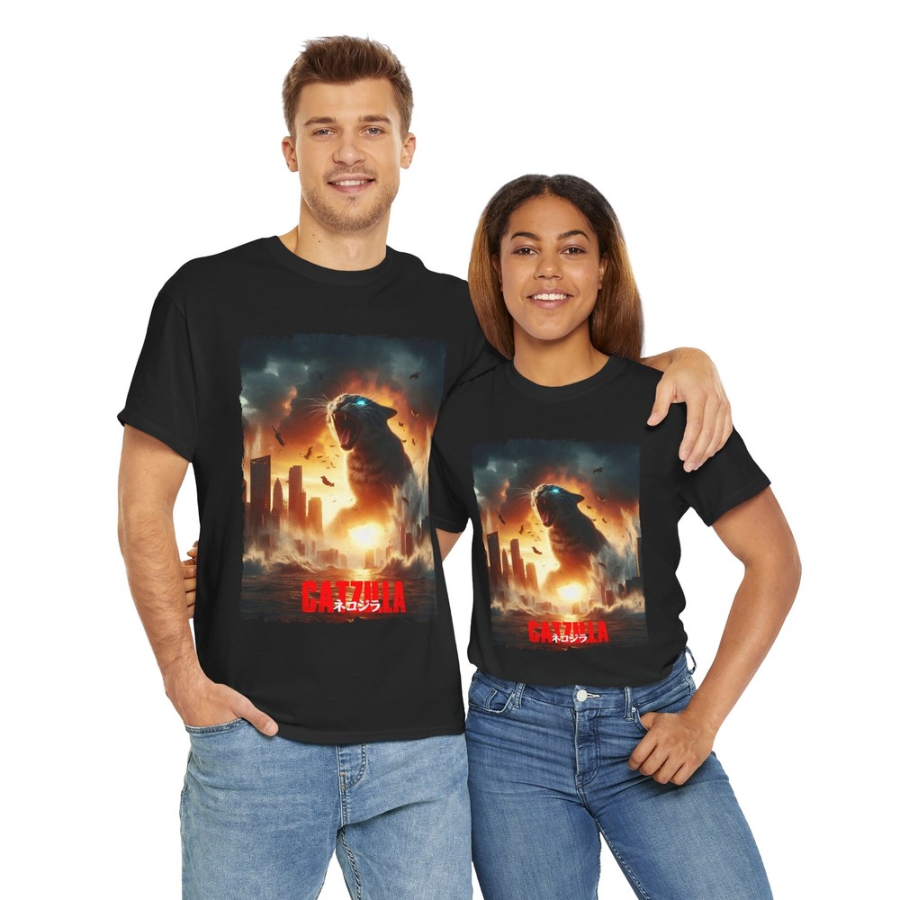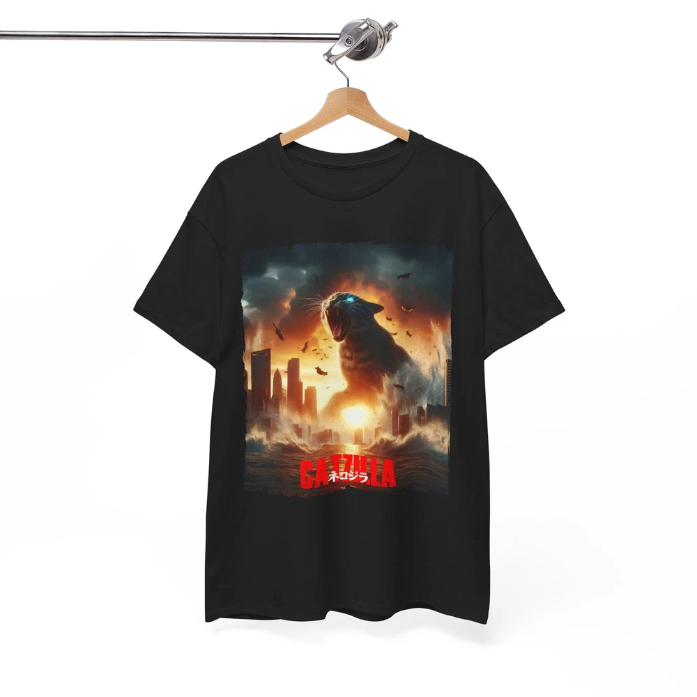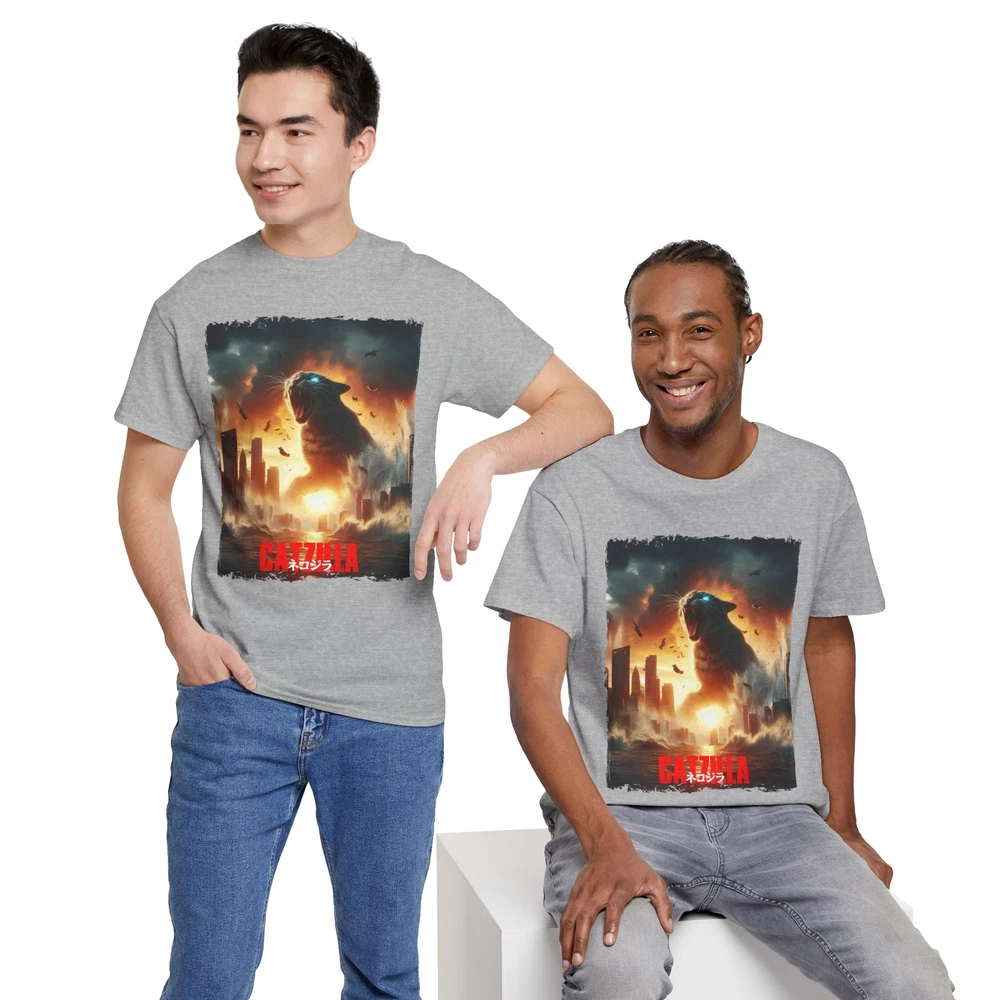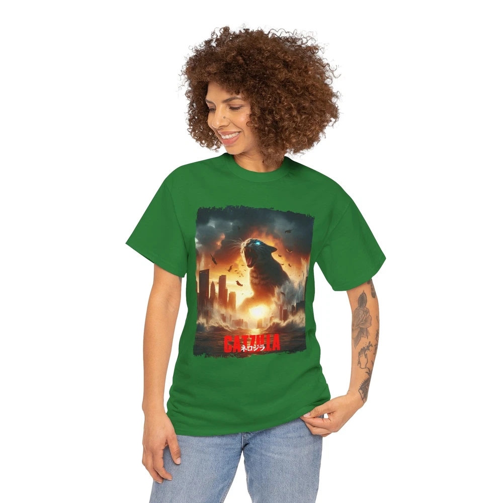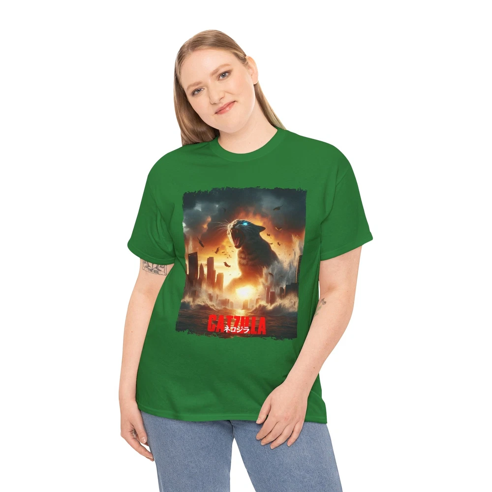 IMPERIAL S M L XL 2XL 3XL 4XL 5XL Width, in 18.00 20.00 22.00 24.00 26.00 28.00 30.00 32.00 Length, in 28.00 29.00 30.00 31.00 32.00 33.00 34.00 35.00 Sleeve length (from center back), in 15.10 16.50 18.00 19.50 21.00 22.40 23.70 25.00 Size tolerance, in 1.50 1.50 1.50 1.50 1.50 1.50 1.50 1.50 ------------------------------------------------------------------------------------------------------------------------------------------------------------------------------ METRIC S M L XL 2XL 3XL 4XL 5XL Width, cm 45.72 50.80 55.88 60.96 66.04 71.12 76.20 81.28 Length, cm 71.12 73.66 76.20 78.74 81.28 83.82 86.36 88.90 Sleeve length (from center back), cm 38.35 41.91 45.72 49.53 53.34 56.90 60.20 63.50 Size tolerance, cm 3.81 3.81 3.81 3.81 3.81 3.81 3.81 3.81 ----------------------------------------------------------------------------------------------------------------------------------------------------------------------------- Unleash feline chaos in style with our Catzilla T-Shirt , the ultimate tee for cat lovers who adore epic, funny, and monster-sized designs. Whether you're a fan of urban legends, Japanese kaiju culture, or just love a sassy cat with a giant attitude, this shirt is made for you. Crafted from 100% ethically grown U.S. cotton, this tee offers a durable yet soft medium-weight fabric (5.3 oz/yd² / 180 g/m²) that feels great on the skin and lasts wear after wear. Its classic fit ensures all-day comfort, while the crew neckline delivers a clean, timeless look perfect for both casual hangouts and relaxed weekends. Designed for cat lovers , kaiju fans , and anyone who enjoys bold, funny, and creative graphic tees, this shirt is more than just a novelty ? it's a wardrobe essential. The tear-away label guarantees a scratch-free experience with no irritation, and its Oeko-Tex certification means it's been tested for harmful substances, ensuring safety and peace of mind. Whether you're buying it for yourself or as a gift for a fellow cat fan, our Catzilla tee brings comfort, laughs, and style together in one perfect package. The unisex heavy cotton tee is the basic staple of any wardrobe. It is the foundation upon which casual fashion grows. All it needs is a personalized design to elevate things to profitability. The specially spun fibers provide a smooth surface for premium printing vividity and sharpness. No side seams mean there are no itchy interruptions under the arms. The shoulders have tape for improved durability. .: Made with medium fabric (5.3 oz/yd² (180 g/m²)) consisting of 100% cotton for year-round comfort that is sustainable and highly durable. .: The classic fit of this shirt ensures a comfy, relaxed wear while the crew neckline adds that neat, timeless look that can blend into any occasion, casual or semi-formal. .: The tear-away label means a scratch-free experience with no irritation or discomfort whatsoever. .: Made using 100% US cotton that is ethically grown and harvested. Gildan is also a proud member of the US Cotton Trust Protocol ensuring ethical and sustainable means of production. This blank tee is certified by Oeko-Tex for safety and quality assurance. The classic fit ensures a comfy, relaxed wear, while the crew neckline adds a neat, timeless look suitable for any occasion, casual or semi-formal. The tear-away label provide a scratch-free experience, ensuring no irritation or discomfort. Key Features: - **Shoulder Tape**: Twill tape covers the shoulder seams to stabilize the back of the garment and prevent stretching. - **No Side Seams**: Knitted in one piece using tubular knit, reducing fabric waste and making the garment more attractive. - **Ribbed Knit Collar**: Highly elastic ribbed knit collar helps retain its shape. - **Durable Fabric**: Specially spun fibers create a smooth surface for premium printing vividity and sharpness. Care Instructions: - Machine wash: warm (max 40C or 105F) - Non-chlorine bleach as needed - Tumble dry: medium - Do not iron - Do not dry clean This unisex heavy cotton tee is the foundation of casual fashion, providing a smooth surface for vibrant and sharp prints. Made from ethically grown and harvested cotton. EU representative : Invicticonte LLC, 2105 Vista Oeste St NW Suite E 1187, Albuquerque, NM, 87120, US Product information : Gildan 5000, 2 year warranty in EU and Northern Ireland as per Directive 1999/44/EC Warnings, Hazard : For adults, Made in Nicaragua Care instructions : Machine wash: warm (max 40C or 105F), Non-chlorine: bleach as needed, Tumble dry: medium, Do not iron, Do not dryclean Keywords: catzilla t-shirt, funny cat shirt, kaiju cat tee, cat graphic t-shirt, monster cat shirt, cat lovers gift, Japanese inspired shirt, cotton t-shirt USA, giant cat tee, urban cat design