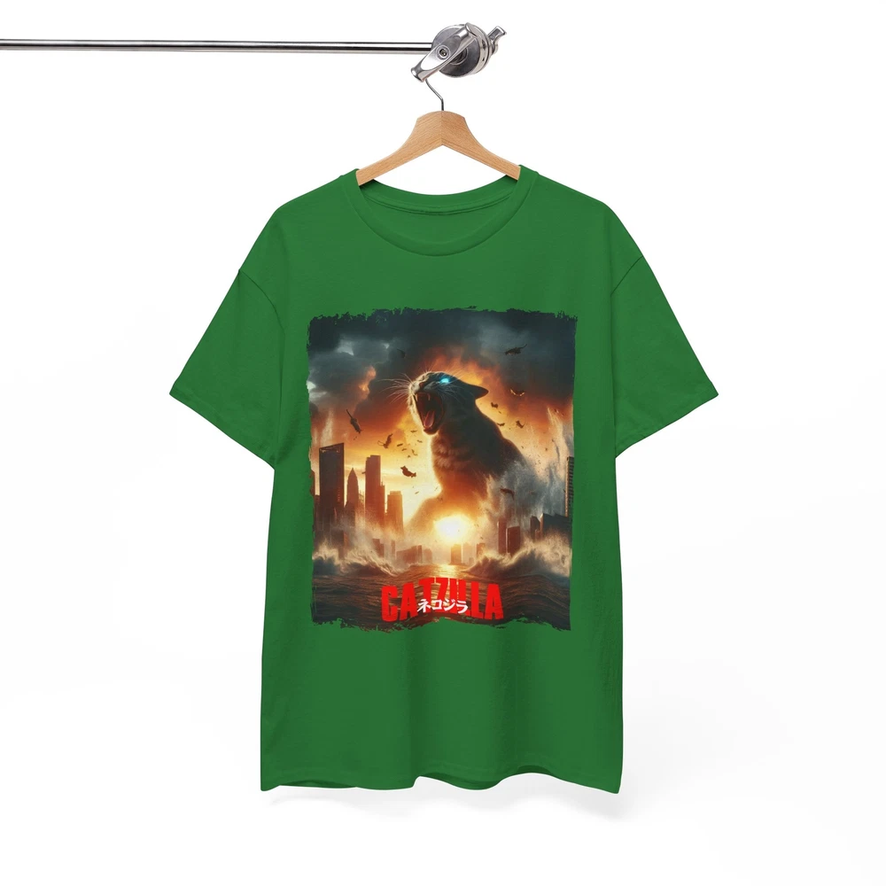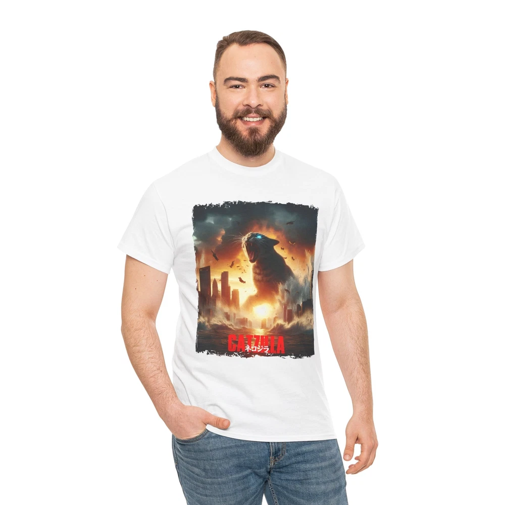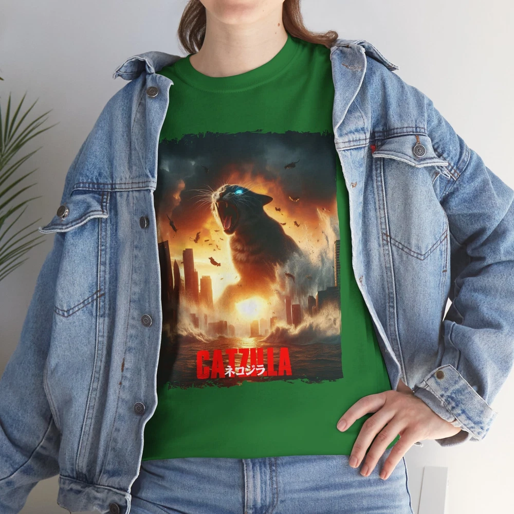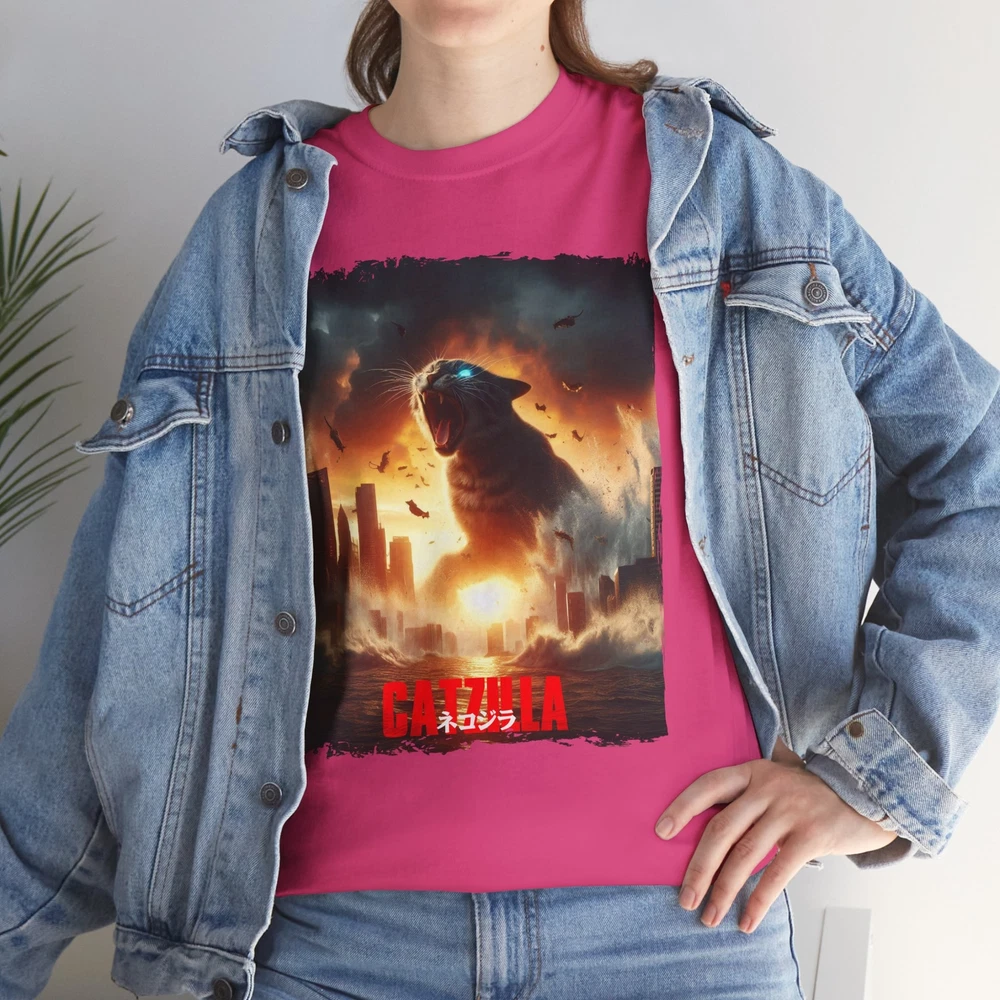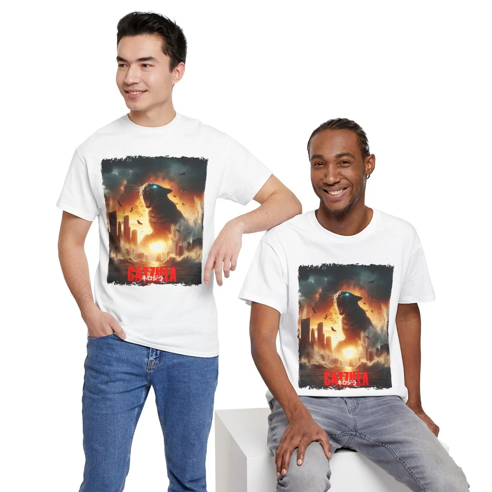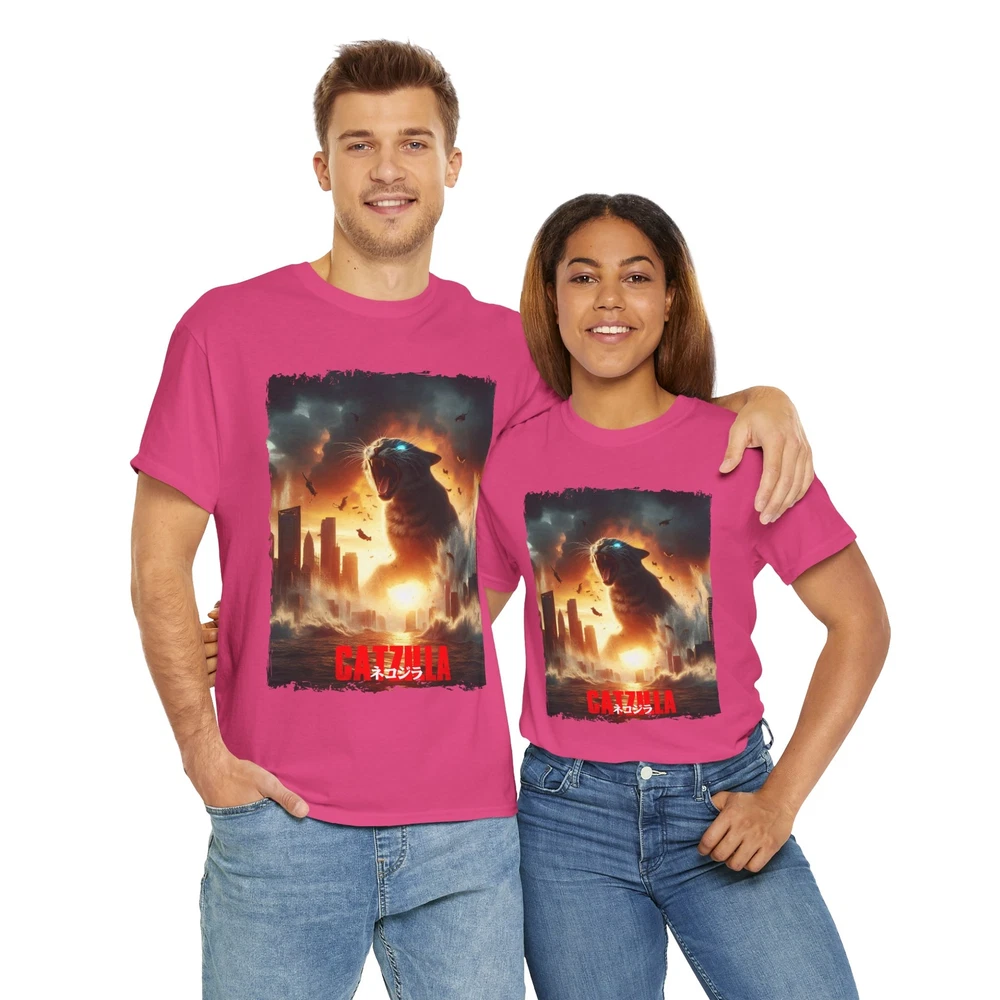 IMPERIAL S M L XL 2XL 3XL 4XL 5XL Width, in 18.00 20.00 22.00 24.00 26.00 28.00 30.00 32.00 Length, in 28.00 29.00 30.00 31.00 32.00 33.00 34.00 35.00 Sleeve length (from center back), in 15.10 16.50 18.00 19.50 21.00 22.40 23.70 25.00 Size tolerance, in 1.50 1.50 1.50 1.50 1.50 1.50 1.50 1.50 ------------------------------------------------------------------------------------------------------------------------------------------------------------------------------ METRIC S M L XL 2XL 3XL 4XL 5XL Width, cm 45.72 50.80 55.88 60.96 66.04 71.12 76.20 81.28 Length, cm 71.12 73.66 76.20 78.74 81.28 83.82 86.36 88.90 Sleeve length (from center back), cm 38.35 41.91 45.72 49.53 53.34 56.90 60.20 63.50 Size tolerance, cm 3.81 3.81 3.81 3.81 3.81 3.81 3.81 3.81 ----------------------------------------------------------------------------------------------------------------------------------------------------------------------------- Unleash feline chaos in style with our Catzilla T-Shirt , the ultimate tee for cat lovers who adore epic, funny, and monster-sized designs. Whether you're a fan of urban legends, Japanese kaiju culture, or just love a sassy cat with a giant attitude, this shirt is made for you. Crafted from 100% ethically grown U.S. cotton, this tee offers a durable yet soft medium-weight fabric (5.3 oz/yd² / 180 g/m²) that feels great on the skin and lasts wear after wear. Its classic fit ensures all-day comfort, while the crew neckline delivers a clean, timeless look perfect for both casual hangouts and relaxed weekends. Designed for cat lovers , kaiju fans , and anyone who enjoys bold, funny, and creative graphic tees, this shirt is more than just a novelty ? it's a wardrobe essential. The tear-away label guarantees a scratch-free experience with no irritation, and its Oeko-Tex certification means it's been tested for harmful substances, ensuring safety and peace of mind. Whether you're buying it for yourself or as a gift for a fellow cat fan, our Catzilla tee brings comfort, laughs, and style together in one perfect package. The unisex heavy cotton tee is the basic staple of any wardrobe. It is the foundation upon which casual fashion grows. All it needs is a personalized design to elevate things to profitability. The specially spun fibers provide a smooth surface for premium printing vividity and sharpness. No side seams mean there are no itchy interruptions under the arms. The shoulders have tape for improved durability. .: Made with medium fabric (5.3 oz/yd² (180 g/m²)) consisting of 100% cotton for year-round comfort that is sustainable and highly durable. .: The classic fit of this shirt ensures a comfy, relaxed wear while the crew neckline adds that neat, timeless look that can blend into any occasion, casual or semi-formal. .: The tear-away label means a scratch-free experience with no irritation or discomfort whatsoever. .: Made using 100% US cotton that is ethically grown and harvested. Gildan is also a proud member of the US Cotton Trust Protocol ensuring ethical and sustainable means of production. This blank tee is certified by Oeko-Tex for safety and quality assurance. The classic fit ensures a comfy, relaxed wear, while the crew neckline adds a neat, timeless look suitable for any occasion, casual or semi-formal. The tear-away label provide a scratch-free experience, ensuring no irritation or discomfort. Key Features: - **Shoulder Tape**: Twill tape covers the shoulder seams to stabilize the back of the garment and prevent stretching. - **No Side Seams**: Knitted in one piece using tubular knit, reducing fabric waste and making the garment more attractive. - **Ribbed Knit Collar**: Highly elastic ribbed knit collar helps retain its shape. - **Durable Fabric**: Specially spun fibers create a smooth surface for premium printing vividity and sharpness. Care Instructions: - Machine wash: warm (max 40C or 105F) - Non-chlorine bleach as needed - Tumble dry: medium - Do not iron - Do not dry clean This unisex heavy cotton tee is the foundation of casual fashion, providing a smooth surface for vibrant and sharp prints. Made from ethically grown and harvested cotton. EU representative : Invicticonte LLC, 2105 Vista Oeste St NW Suite E 1187, Albuquerque, NM, 87120, US Product information : Gildan 5000, 2 year warranty in EU and Northern Ireland as per Directive 1999/44/EC Warnings, Hazard : For adults, Made in Nicaragua Care instructions : Machine wash: warm (max 40C or 105F), Non-chlorine: bleach as needed, Tumble dry: medium, Do not iron, Do not dryclean Keywords: catzilla t-shirt, funny cat shirt, kaiju cat tee, cat graphic t-shirt, monster cat shirt, cat lovers gift, Japanese inspired shirt, cotton t-shirt USA, giant cat tee, urban cat design