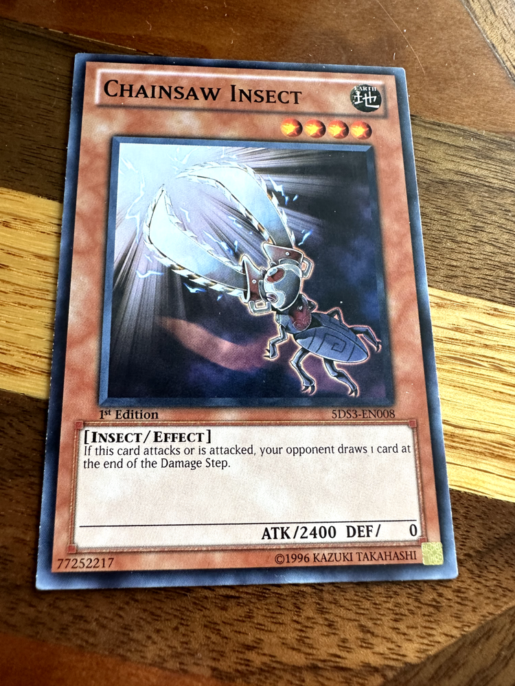 Hello! You are buying one Chainsaw Insect 5DS3-EN008 1st Edition Common in lightly played condition. Reason for lightly played condition is minor general play/scratchwear, mostly on back. See photos for details! As a thank you for buying from me, I will throw in two free Yugioh commons! Thank you so much for looking, have a great day! If there is ever an issue, please let me know so I can do whatever I can to resolve it! Please check out my other items! I have many more single cards!
