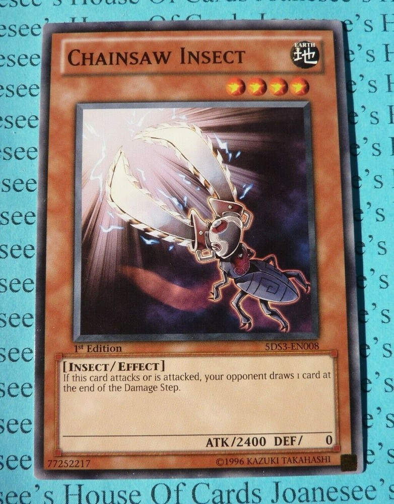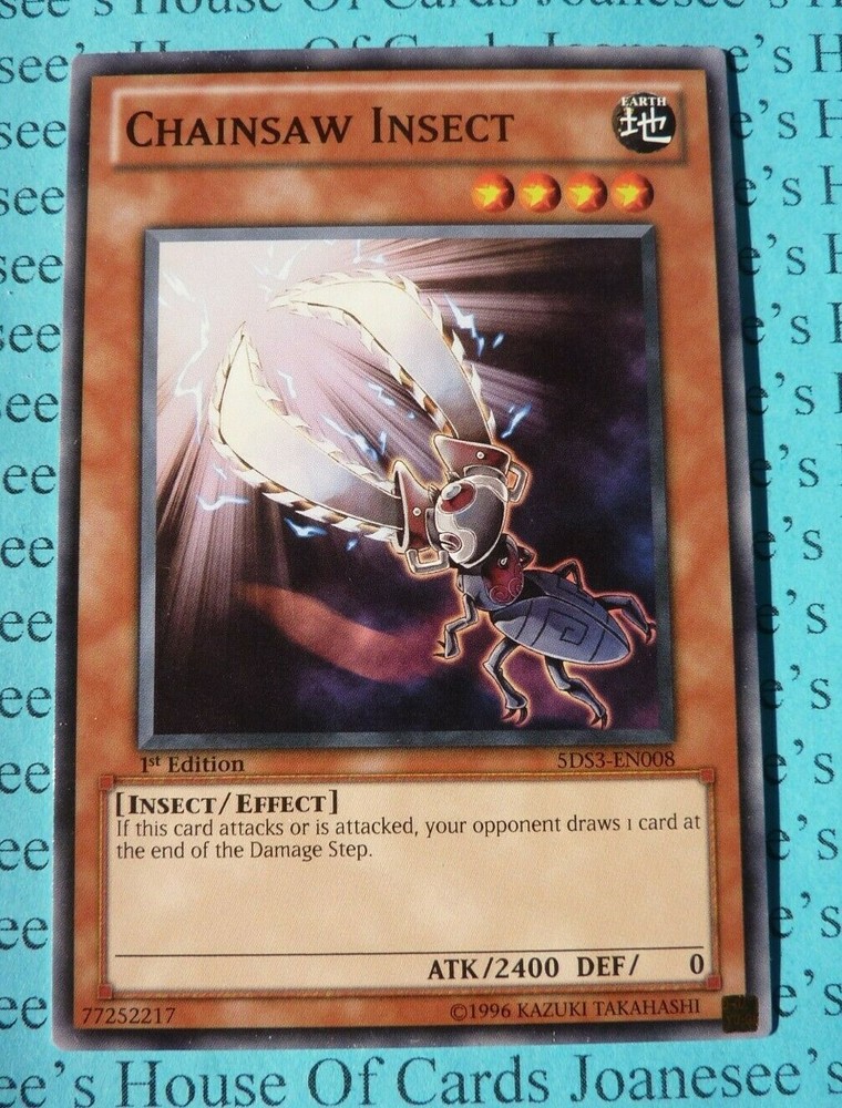 This is the Common Earth Insect Chainsaw Insect 4 Stars ATK/2400 DEF/0 Card text: At the end of the Damage Step, if this card attacked or was attacked: Your opponent draws 1 card. 5DS3-EN008 1st Edition English Mint/NMint Condition Totally Original Konami (or your money back!) I will deliver in safe packaging to keep it in perfect condition. Ideal for players and collectors alike. Check out my other items! I will combine postage costs for multiple purchases. Sign up for my email newsletters by adding my eBay Shop to your favourites