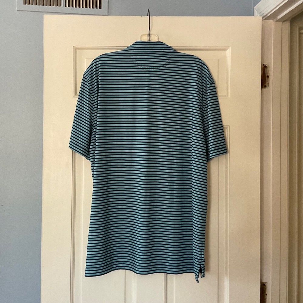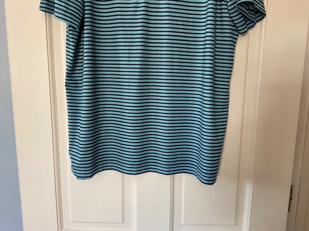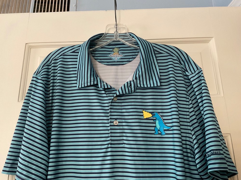 Chubbies The Fired Up Godzilla Polo Shirt Blue Stripe Stretch Performance Mens L Underarm across approximately 23 “. Length approximately 30 “. Excellent condition. EUC. Smoke free and pet free.