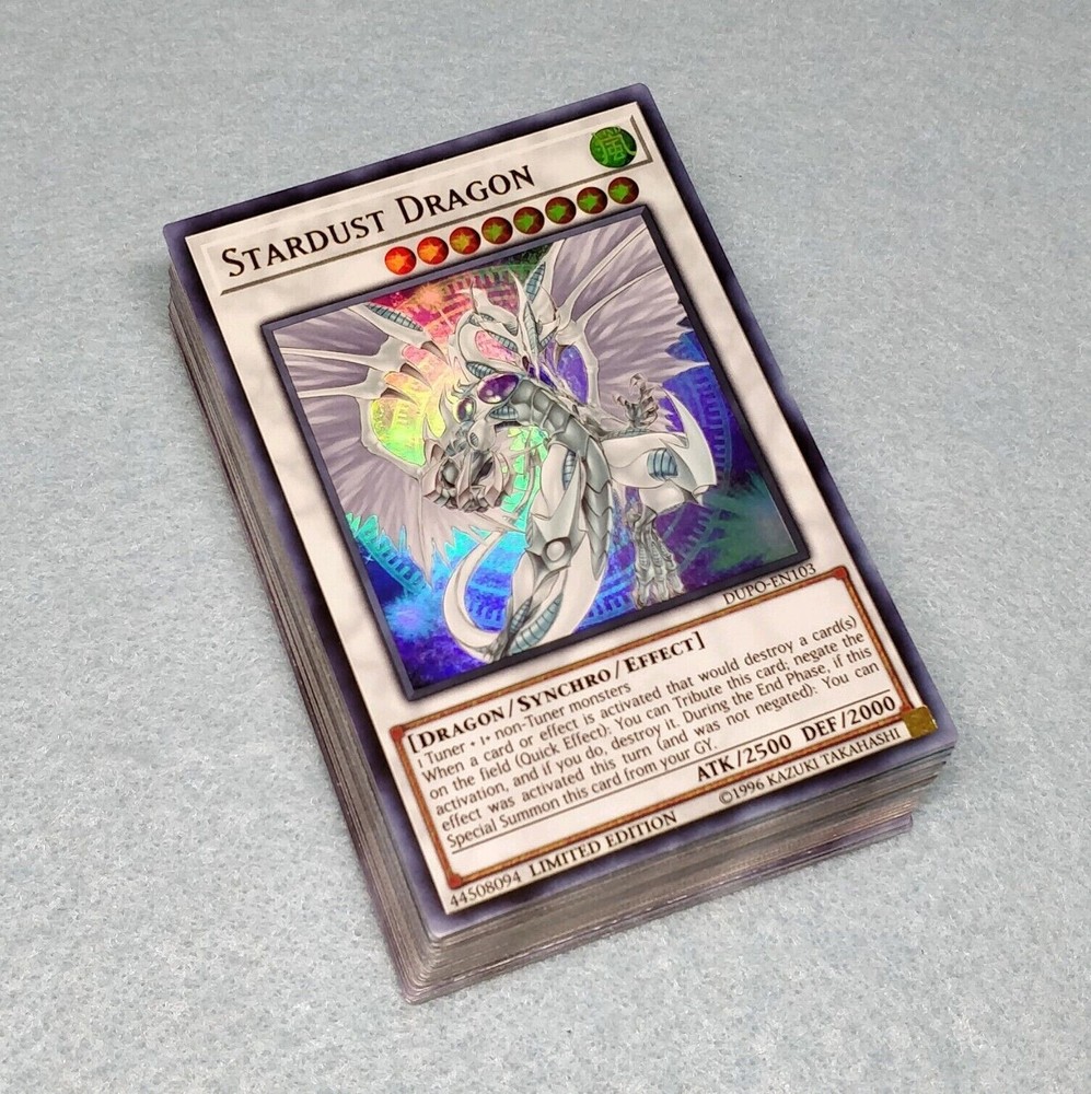 Hello all I am a New Ebay Seller!!! I am a Female Yugioh & Magic Collector!!! Happy Bidding!!! A bonus for ordering you will also Get a Free Holo Card from my collection. It maybe Super Rare, Ultra Rare, or SECRET Rare!!! Picture may have been edited due to Inventory Changes Please read description Below Item for sale is: Monsters (28): 2x Rush Warrior 2x Unknown Synchron 3x Synchron Explorer 3x Quillbolt Hedgehog 3x Converging Wills Dragon 3x Stardust Trail 3x Majestic Dragon (Rare) 3x Stardust Xiaolong (Rare) 1x Speedroid Terrortop 1x Speedroid Taketomborg 1x Speedroid Red-Eyed Dice 1x Speedroid Den-Den Daiko Duke 1x Baby Mudragon 1x Exiled Force* Spells (10): 3x Majestic Absorption 1x Synchro Dilemma (Rare) 1x United We Stand* 1x Forbidden Lance 1x Forbidden Dress 1x Supply Squad 1x Speedlift 1x Different Dimension Capsule Traps (6): 1x Majestic Mirage (Super Rare) 1x Call of the Haunted 1x Junk Sleep 3x Converging Wishes (Rare) Extra Deck (3): 1x Stardust Dragon (Ultra Rare) 1x Stardust Assault Warrior 1x Stardust Warrior