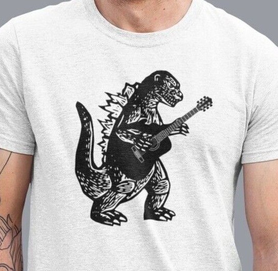 Cool Guitar T Shirt Vintage Godzilla Acoustic Electric Bass Dinosaur Cool Tee