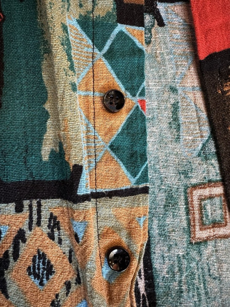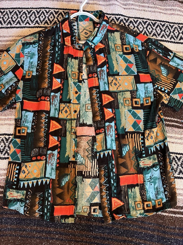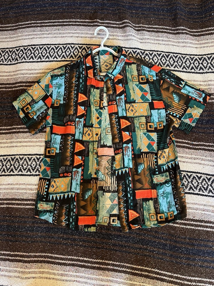 This is a men's button-up Hawaiian shirt featuring a cool retro vintage element art print. It has short sleeves, a button closure, and is made of polyester material. The shirt is size L and suitable for regular size type. The design includes a Godzilla character theme in a multicolor pattern, perfect for a stylish and unique look in the summer or spring seasons. Personalization is not available for this shirt.