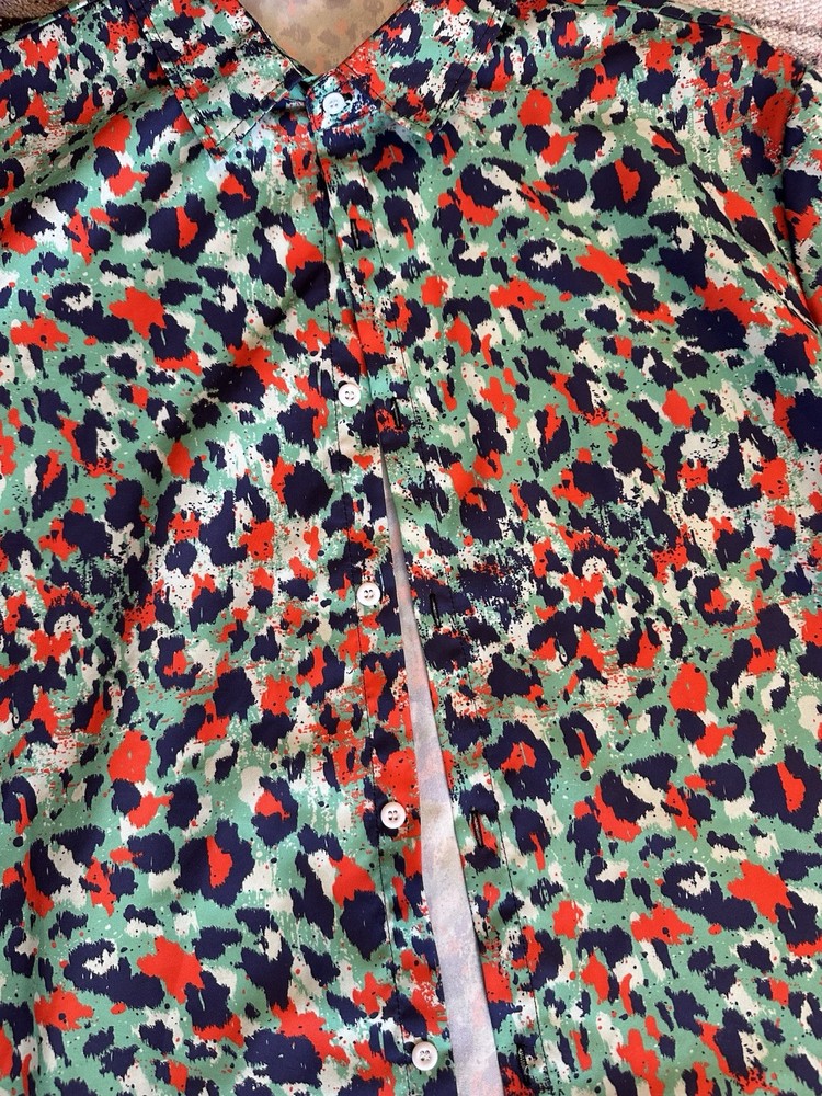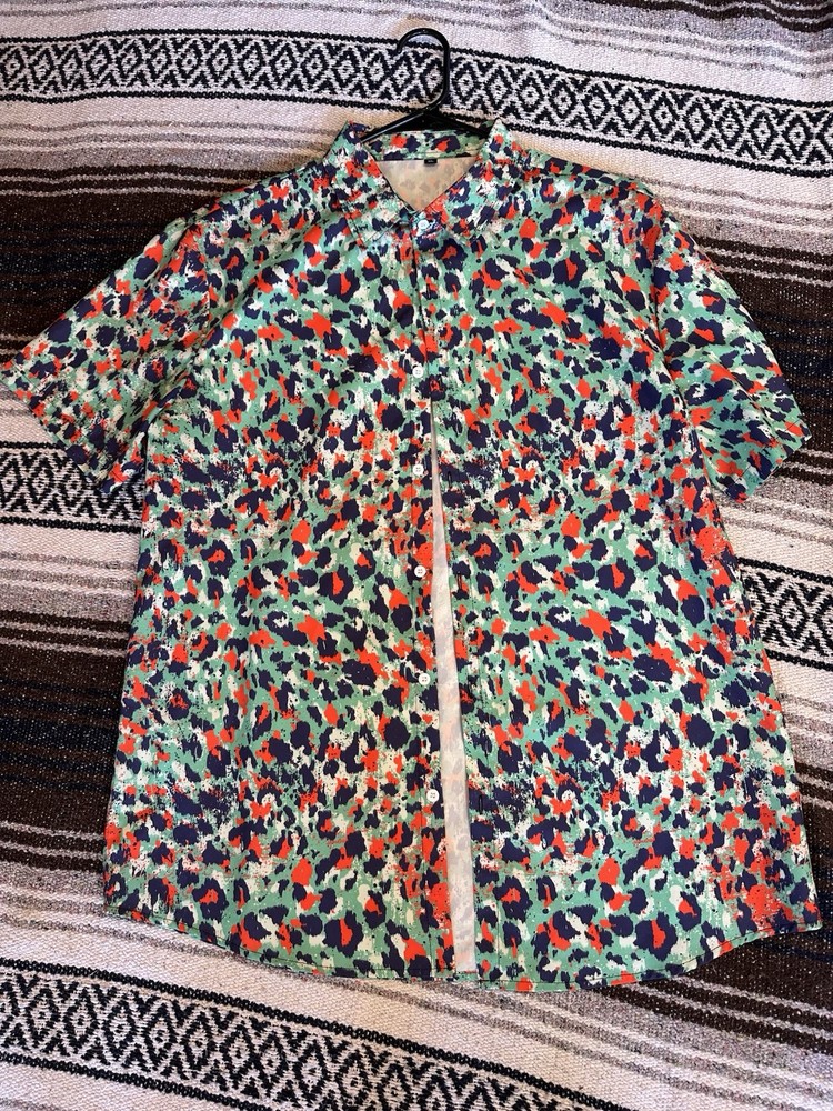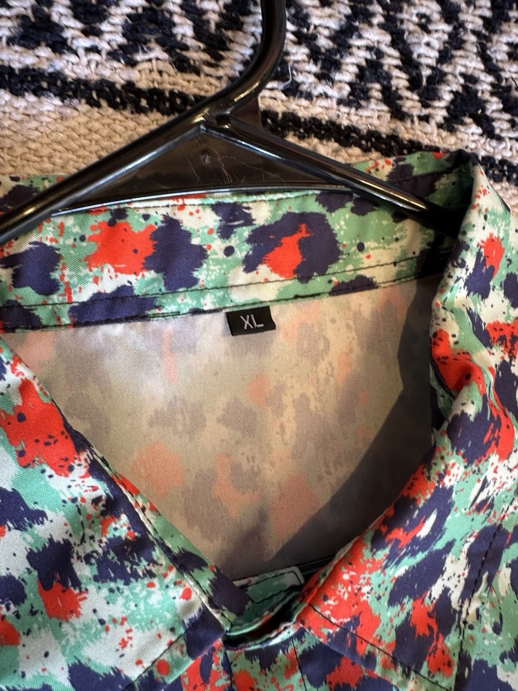 This men's button-up shirt in size XL features a cool retro vintage art print with a Godzilla character theme. It has short sleeves, a button closure, and is made of polyester material. The colorful multicolor design makes it a unique addition to your wardrobe, perfect for a stylish and eye-catching look during the summer and spring seasons.