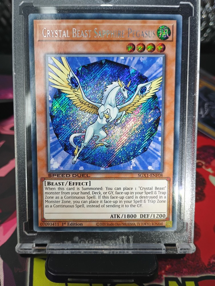 Elevate your Speed Duel GX collection with the majestic Crystal Beast Sapphire Pegasus, a Secret Rare card that boasts an impressive 1200 defense and 1800 attack power. From the Duel Academy Box set, this card is a must-have for any serious player or collector. Its unique Effect type can turn the tide of battle in your favor, making it a versatile addition to your deck. The card, numbered SGX1-ENF08, features the captivating "Wind" attribute and comes in English language. As a 1st Edition release by Konami, it holds a special place in the Yu-Gi-Oh! TCG lore. Whether you're looking to dominate the dueling arena or seeking to complete your card display, Crystal Beast Sapphire Pegasus is an exemplary choice.