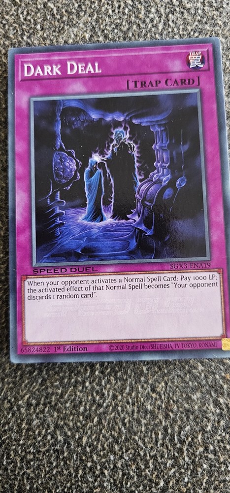Dark Deal SGX3-ENA19 from Speed Duel GX: Duelists of Shadows 1st Edition is a Trap card in the Yu-Gi-Oh! TCG. When activated, it allows you to pay 1000 Life Points to change the effect of your opponent's Normal Spell Card to make them discard a random card. This card is in English and is a Common / Short Print rarity.