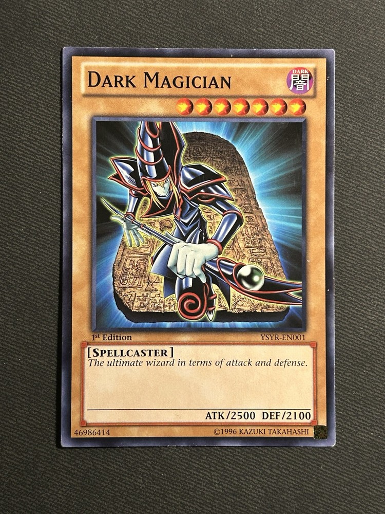 The product is a 1st Edition Dark Magician card from the Yugi Reloaded set in the Yu-Gi-Oh! TCG. It is a Common/Short Print card with 2500 Attack and 2100 Defense, featuring the Spellcaster monster type. The card number is YSYR-EN001 and it is in English language. This collectible card game item is manufactured by Konami.