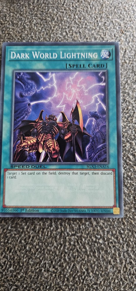 The product is a 1st Edition Spell card named "Dark World Lightning" from the Speed Duel GX: Duelists of Shadows set for the Yu-Gi-Oh! TCG. It has the card number SGX3-ENA16 and features the ability to target and destroy a Set card on the field, followed by discarding 1 card. The card is in English and is in near mint or better condition. It is a Common/Short Print card manufactured by Konami.