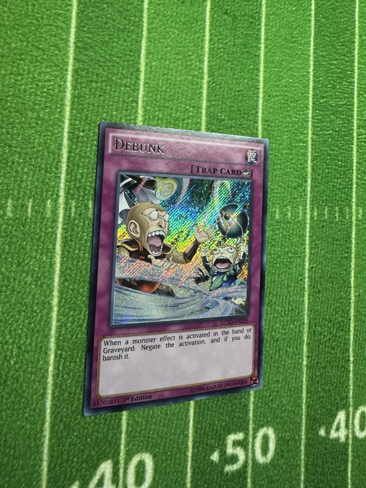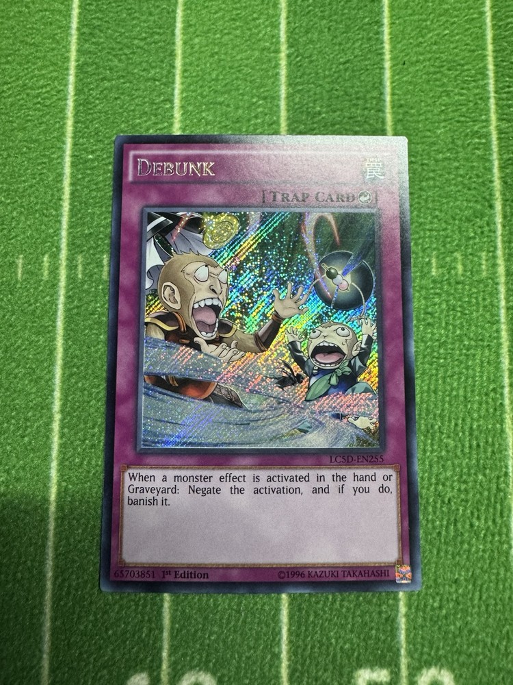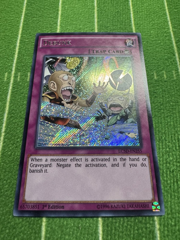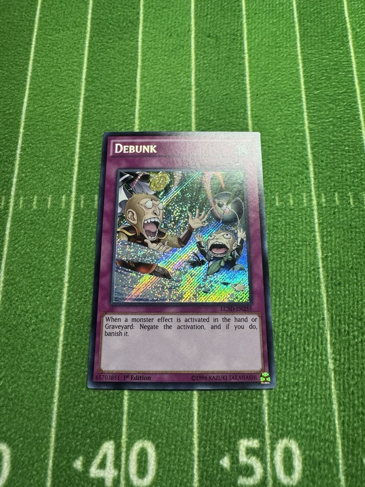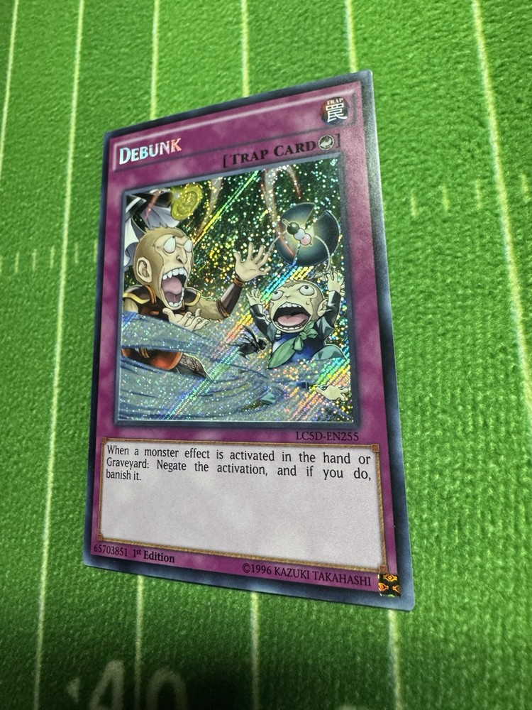 The "Debunk" card is a Secret Rare 1st Edition Trap card from the Yu-Gi-Oh! TCG Legendary Collection 5D's set. It features an Attack/Power of 0 and a Defense/Toughness of 0. This English language card is manufactured by Konami and has the card number LC5D-EN255. A valuable addition to any Yu-Gi-Oh! card collection, this card is highly sought after by collectors and players alike for its rarity and strategic usefulness in gameplay.