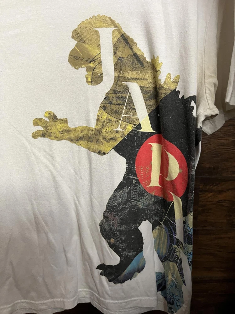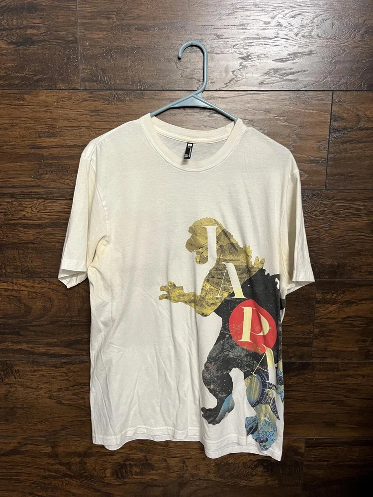 Design by Humans Big Japan by ecsu Brazil - Godzilla Japan SIZE: LARGE Brand: Design by Humans Material: 50% Cotton 50% Polyester Made in Guatemala Condition: Good / Used Sizing: Large Length: 28 inch Width: 20 inch Sleeve: 9 inch If you have any questions, need more pics... let me know :)