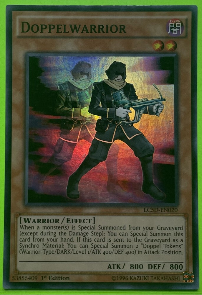 Doppelwarrior - LC5D-EN020 - Super Rare - 1st Edition Image is a stock photo of the card. You will receive the card in Moderately Played condition Condition: Moderately Played ATK/DEF : 800/800 Attribute : Dark Card Number : LC5D-EN020 Card Rules : Card Text : When a monster is Special Summoned from your Graveyard, you can Special Summon this card from your hand. If this card is sent to the Graveyard as a Synchro Material Monster, you can Special Summon 2 "Doppel Tokens" (Warrior-Type/DARK/Level 1/ATK 400/DEF 400) in Attack Position. Card Type : Effect Monster Edition : 1st Level : 2 Monster Type : Warrior Name : Doppelwarrior Passcode : 53855409 Pendulum Scale : Rarity : Super Rare Set : Legendary Collection 5D's Mega Pack Be sure to visit our store for a wide selection of your favorite cards! We are running specials RIGHT NOW!! Shipping Options: ~Ships in a regular white envelope with a stamp for FREE! (THERE IS NO TRACKING INFORMATION AVAILABLE FOR THE ABOVE METHOD. SHIPPING TIME IS 4-10 BUSINESS DAYS) ~Ships in a TRACKEDbubble mailer for $5.99! ~Shipments are handled same or next business day. ~FREE SHIPPING for each additional card, so shop around our store!