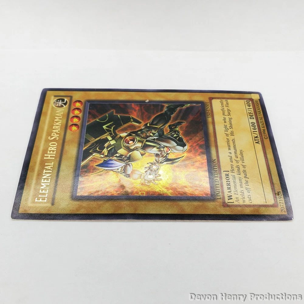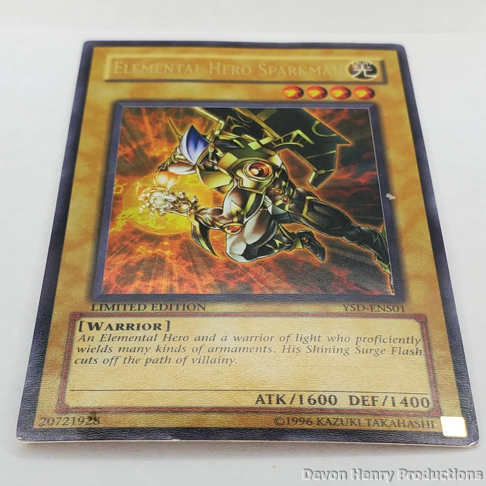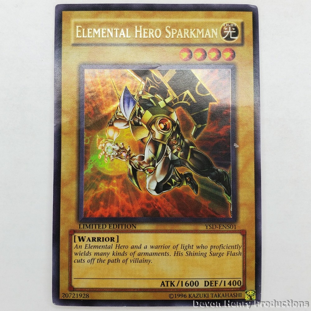 Elemental Hero Sparkman Ultra Rare Limited Edition card from the 2006 Starter Deck: GX set YSD-ENS01 single. Condition - Lightly Played. Shipped with eBay Standard Envelope for Trading Cards, Stamps, Postcards & Coins up to $20, card will be inside ziplocked sandwich bag inside. These pictures were taken by me, the card you see is the card you are receiving. I know what you're thinking, why isn't he selling this for a million dollars??? Here's why: - This card has spent only half of its life in a sleeve, it's other half resided in a deck but never played - Due to being in a deck, the foil has light wear from rubbing on other cards after examination. See picture to examine further - I rank the condition as Lightly Played, it is NOT Mint - As you can see in the pictures, the edges have slight wear - Have questions? Suggestions? Be sure to ask! - Ultra Rare Card - Limited Edition - Not 1st Edition - No misprints - Condition: Lightly Played ELEMENTAL HERO SPARKMAN - YuGiOh Ultra Rare - Starter Deck: GX YSD-ENS01 - LP. Condition is "Used". Shipped with eBay Standard Envelope for Trading Cards, Stamps, Postcards & Coins up to $20.