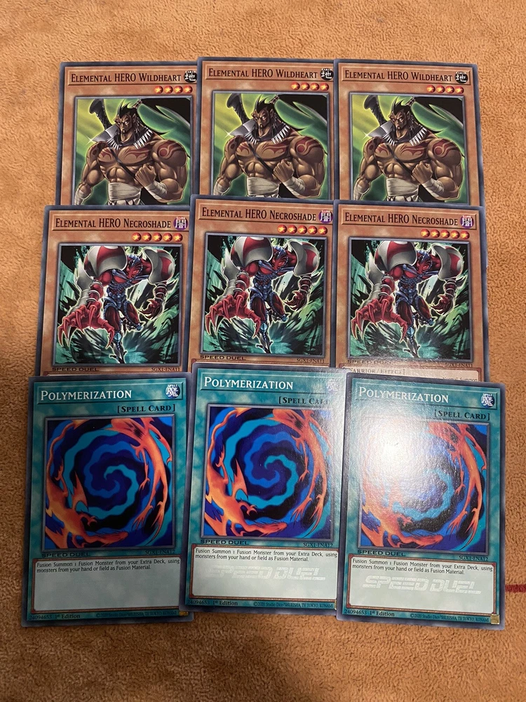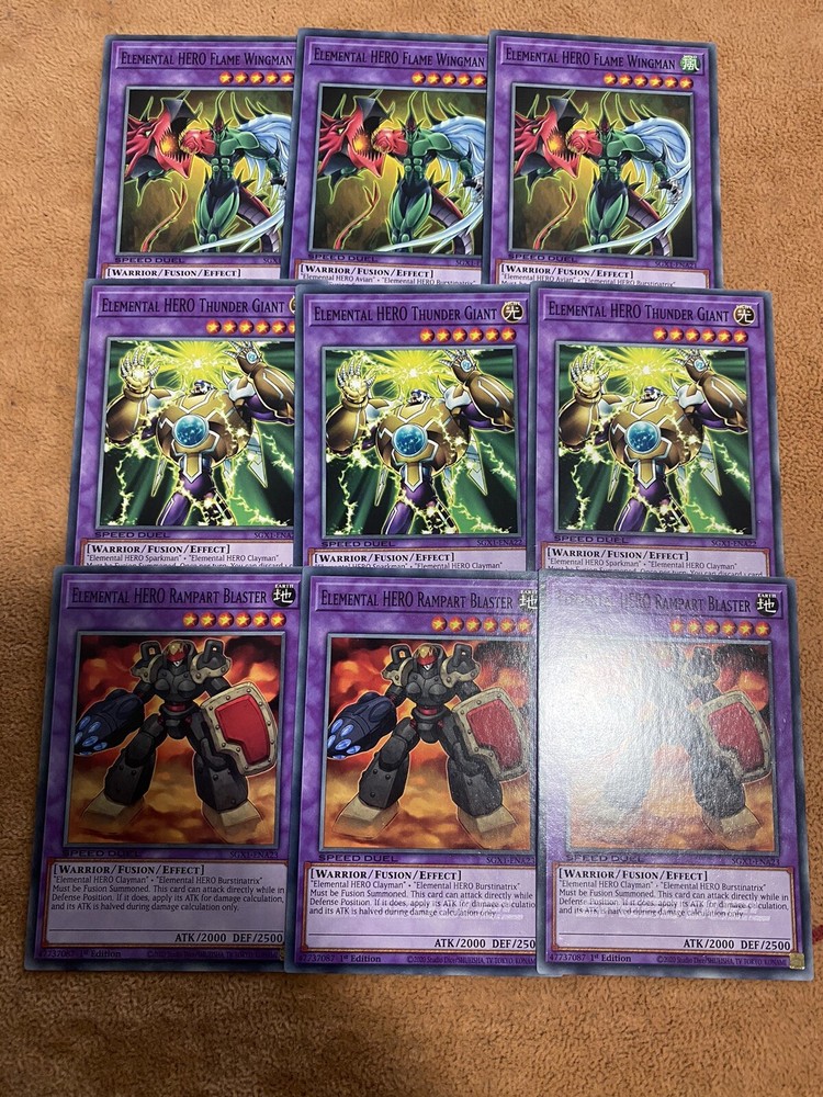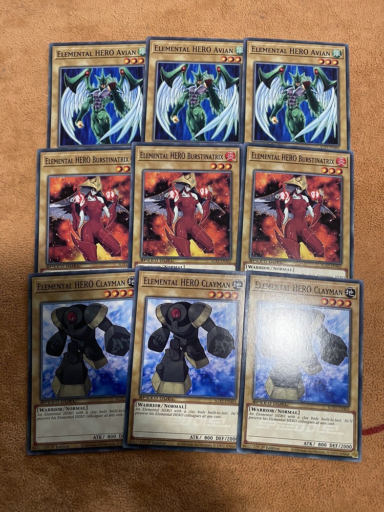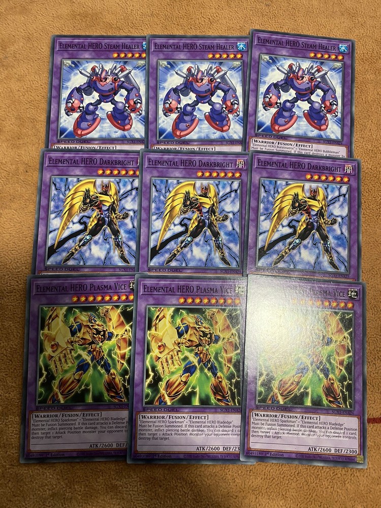 🔥Yugioh Elemental HERO 78 Card DECK CORE SPEED DUEL GX SGX1 The Elemental Hero Deck from Yu-Gi-Oh! Speed Duel GX is a powerful and versatile set of cards that can help you defeat your opponents in a variety of ways. The deck consists of 20 cards, including iconic monsters like Elemental Hero Burstinatrix and Elemental Hero Sparkman, as well as spell and trap cards that can boost your monsters' attack power or protect them from harm. With the right strategy, you can use the Elemental Hero Deck to summon powerful fusion monsters like Elemental Hero Flame Wingman and Elemental Hero Thunder Giant, and deal devastating blows to your opponents. So if you're looking for a deck that's full of heroism and excitement, give the Elemental Hero Deck a try! SGX1-ENA01 " Elemental HERO Avian " Common Normal Monster Speed Duel debut 1 SGX1-ENA02 " Elemental HERO Burstinatrix " Common Normal Monster Speed Duel debut 1 SGX1-ENA03 " Elemental HERO Clayman " Common Normal Monster Speed Duel debut 1 SGX1-ENA04 " Elemental HERO Sparkman " Common Normal Monster Speed Duel debut 1 SGX1-ENA05 " Goddess with the Third Eye " Common Effect Monster Speed Duel debut 1 SGX1-ENA06 " Winged Kuriboh " Common Effect Monster Speed Duel debut 1 SGX1-ENA07 " Wroughtweiler " Common Effect Monster Speed Duel debut 1 SGX1-ENA08 " Elemental HERO Bubbleman " Common Effect Monster Speed Duel debut 1 SGX1-ENA09 " Elemental HERO Bladedge " Common Effect Monster Speed Duel debut 1 SGX1-ENA10 " Elemental HERO Wildheart " Common Effect Monster Speed Duel debut 1 SGX1-ENA11 " Elemental HERO Necroshade " Common Effect Monster Speed Duel debut 1 SGX1-ENA12 " Polymerization " Common Normal Spell Reprint 1 SGX1-ENA13 " Fusion Sage " Common Normal Spell Speed Duel debut 1 SGX1-ENA14 " Reinforcement of the Army " Common Normal Spell Reprint 1 SGX1-ENA15 " Skyscraper " Common Field Spell Speed Duel debut 1 SGX1-ENA16 " Fusion Recovery " Common Normal Spell Reprint 1 SGX1-ENA17 " R - Righteous Justice " Common Normal Spell Speed Duel debut 1 SGX1-ENA18 " Negate Attack " Common Counter Trap Reprint 1 SGX1-ENA19 " A Hero Emerges " Common Normal Trap Speed Duel debut 1 SGX1-ENA20 " Hero Signal " Common Normal Trap Speed Duel debut 1 SGX1-ENA21 " Elemental HERO Flame Wingman " Common Effect Fusion Monster Speed Duel debut 1 SGX1-ENA22 " Elemental HERO Thunder Giant " Common Effect Fusion Monster Speed Duel debut 1 SGX1-ENA23 " Elemental HERO Rampart Blaster " Common Effect Fusion Monster Speed Duel debut 1 SGX1-ENA24 " Elemental HERO Steam Healer " Common Effect Fusion Monster Speed Duel debut 1 SGX1-ENA25 " Elemental HERO Darkbright " Common Effect Fusion Monster Speed Duel debut 1 SGX1-ENA26 " Elemental HERO Plasma Vice " Common Effect Fusion Monster Speed Duel debut 1 This item will be sent in a plastic sleeve/deck protector sleeve and in a Bubble Envelope for maximum protection. I usually ship out the next business day. Payment is due immediately. The faster the payment the faster i'll ship out. Questions or comments?? Feel free to contact me. I'll get back to you within 24 hours. Check out my eBay store for more Yugioh items!