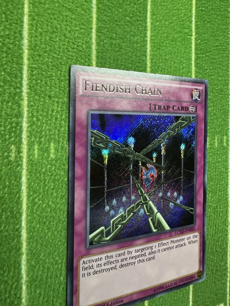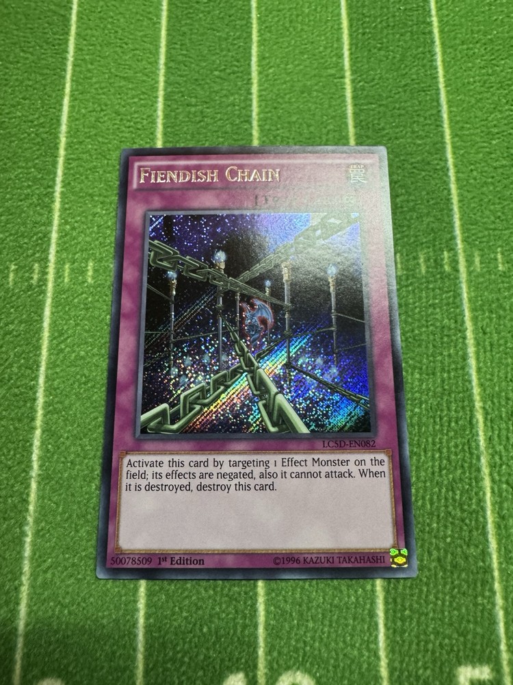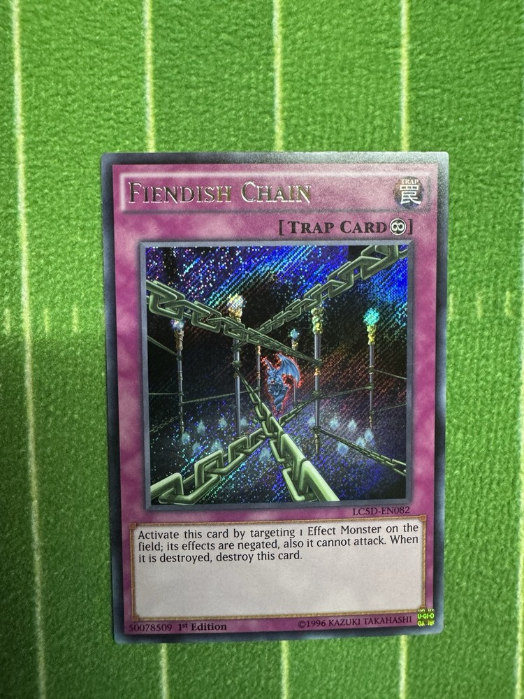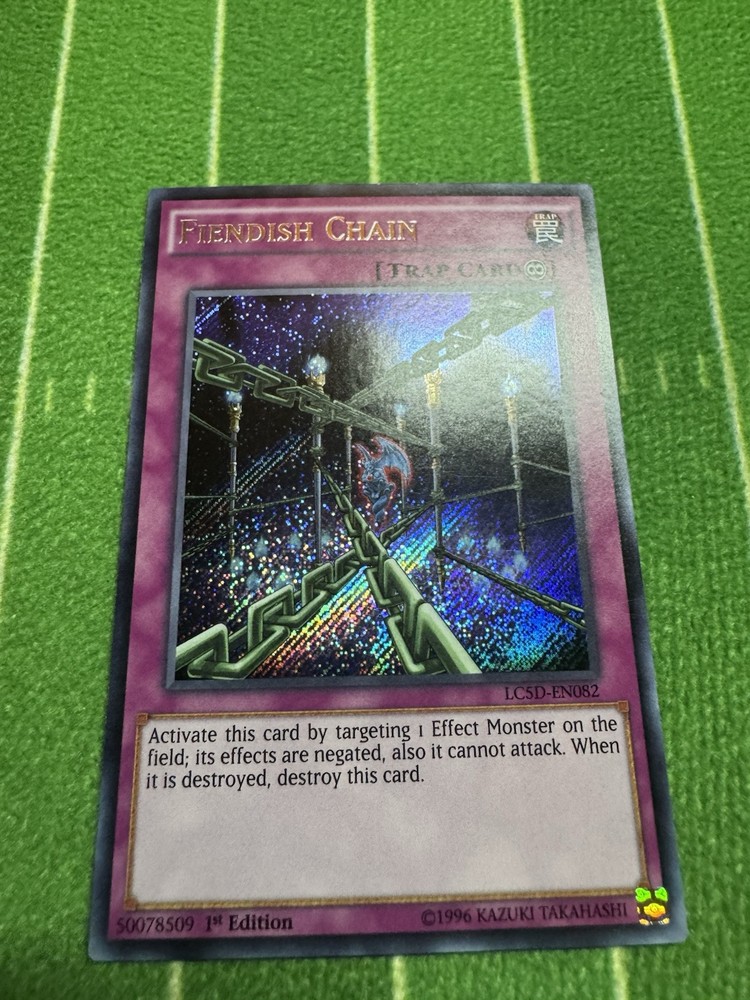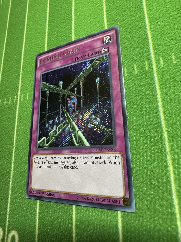 The "Fiendish Chain" card is a Trap-Normal card from the Legendary Collection 5D's set of the Yu-Gi-Oh! TCG. It is a Secret Rare 1st Edition card with a card number of LC5D-EN082. The card has an Attack/Power of 0 and a Defense/Toughness of 0. It features the color attribute of Trap and is manufactured by Konami. The card is in English language.