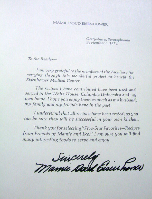 1974, Golden Press, NY 272 pp, 8 3/4 x 11 1/4 From Mamie Eisenhower: "The recipes I have contributed have been used and served in the White House, Columbia University and my own home. I hope you enjoy them as much as my husband, my family and my friends have in the past." Other recipes in the cookbook are from their friends... --You must see my Ebay bookstore-Great Pandas At the top of this page click on: Visit store. Sort: ending soonest, to shop by orderly categories.