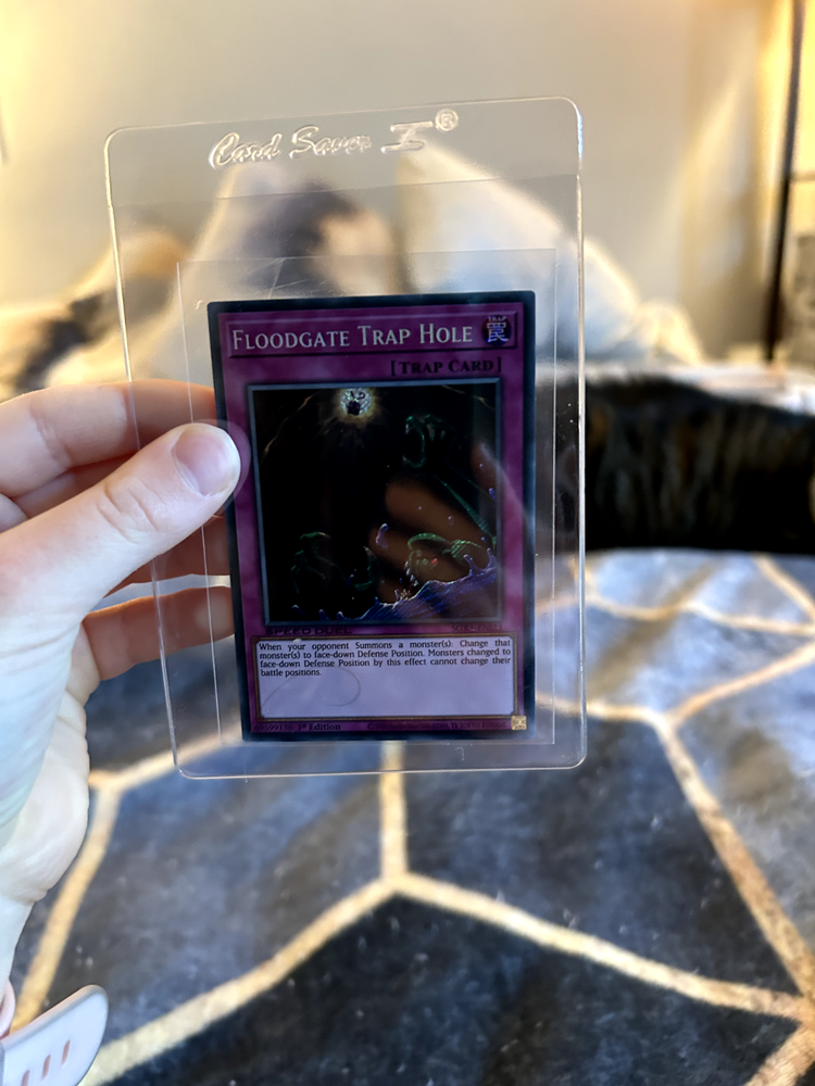The "Floodgate Trap Hole" card is a Secret Rare from the Speed Duel GX: Duel Academy Box. It features the GX Speciality and is part of the Yu-Gi-Oh! TCG. This 1st Edition card is a Trap-Normal type with the card number SGX1-ENI23, manufactured by Konami. It is in English language and is associated with the Box character in the game.