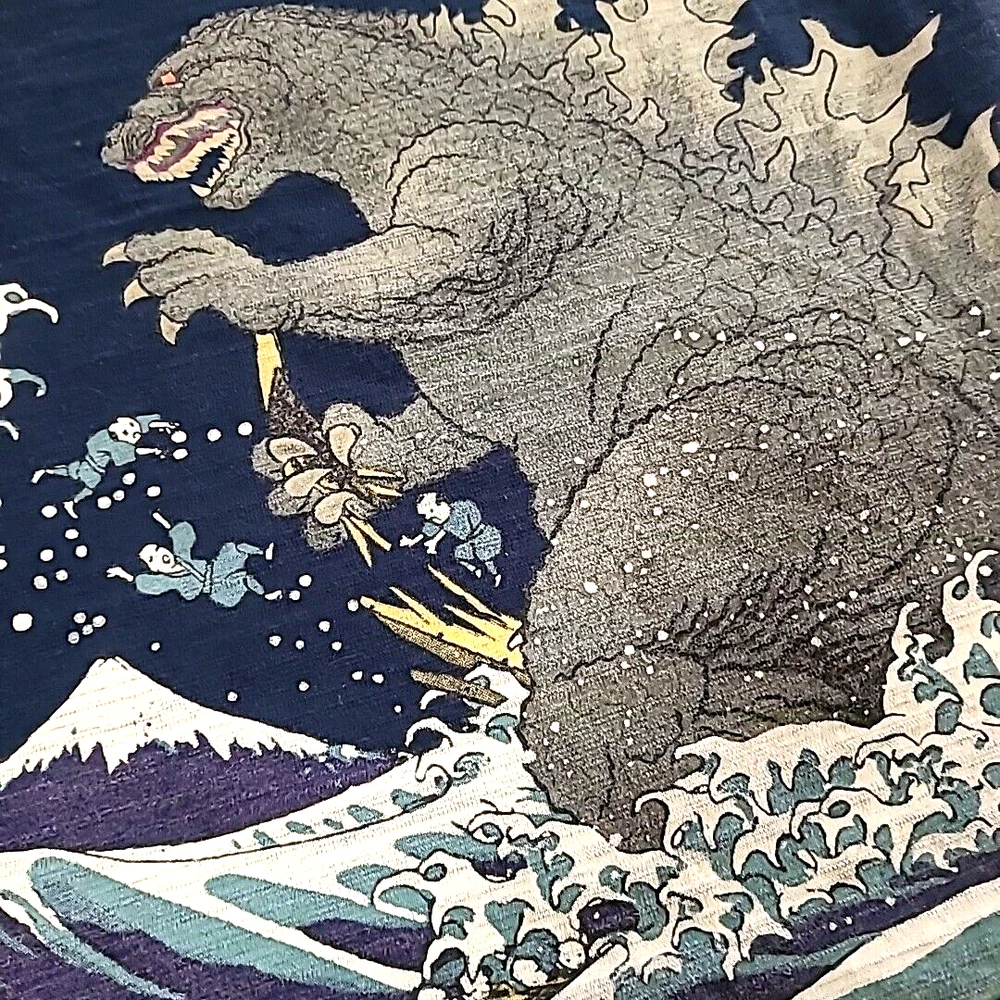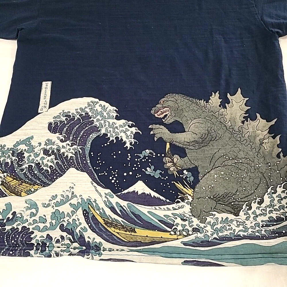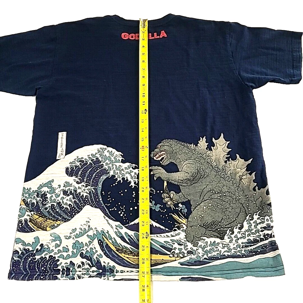 iconic monster with this Folcart Toho Godzilla Hokusai Ukiyo-e T-Shirt. Featuring a unique discharged print that is infused into the fabric, this shirt showcases a stunning design inspired by the famous Japanese artist Hokusai. XXL shirt comes in a stunning blue color and is officially licensed by Toho, the creators of the legendary Godzilla franchise. Whether you're a die-hard fan or just appreciate great design, this Folcart Toho Godzilla Hokusai Ukiyo-e T-Shirt is a must-have addition to your collection. Godzilla vs wave and boat APPROXIMATE MEASUREMENTS LAYING FLAT armpit across to armpit 22" back of neckline down to bottom hemline 27.5"