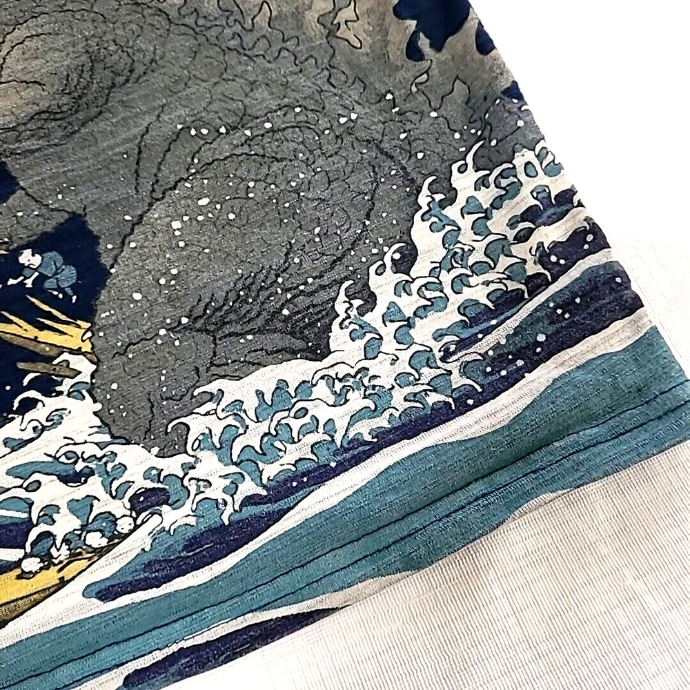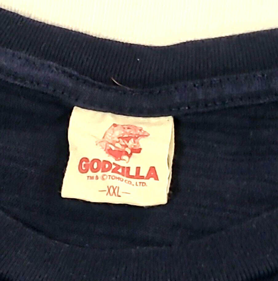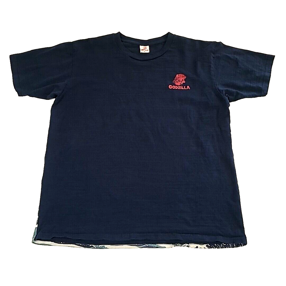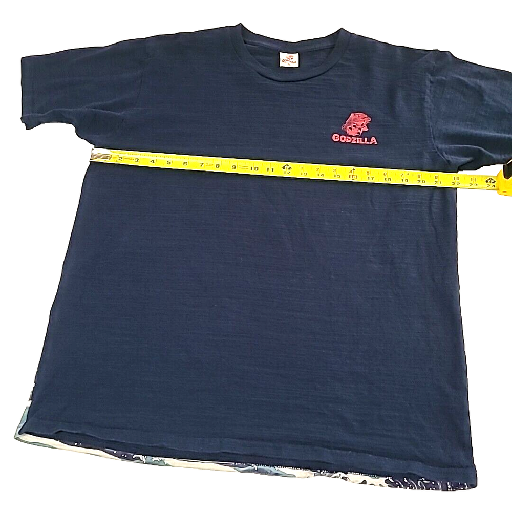 iconic monster with this Folcart Toho Godzilla Hokusai Ukiyo-e T-Shirt. Featuring a unique discharged print that is infused into the fabric, this shirt showcases a stunning design inspired by the famous Japanese artist Hokusai. XXL shirt comes in a stunning blue color and is officially licensed by Toho, the creators of the legendary Godzilla franchise. Whether you're a die-hard fan or just appreciate great design, this Folcart Toho Godzilla Hokusai Ukiyo-e T-Shirt is a must-have addition to your collection. Godzilla vs wave and boat APPROXIMATE MEASUREMENTS LAYING FLAT armpit across to armpit 22" back of neckline down to bottom hemline 27.5"
