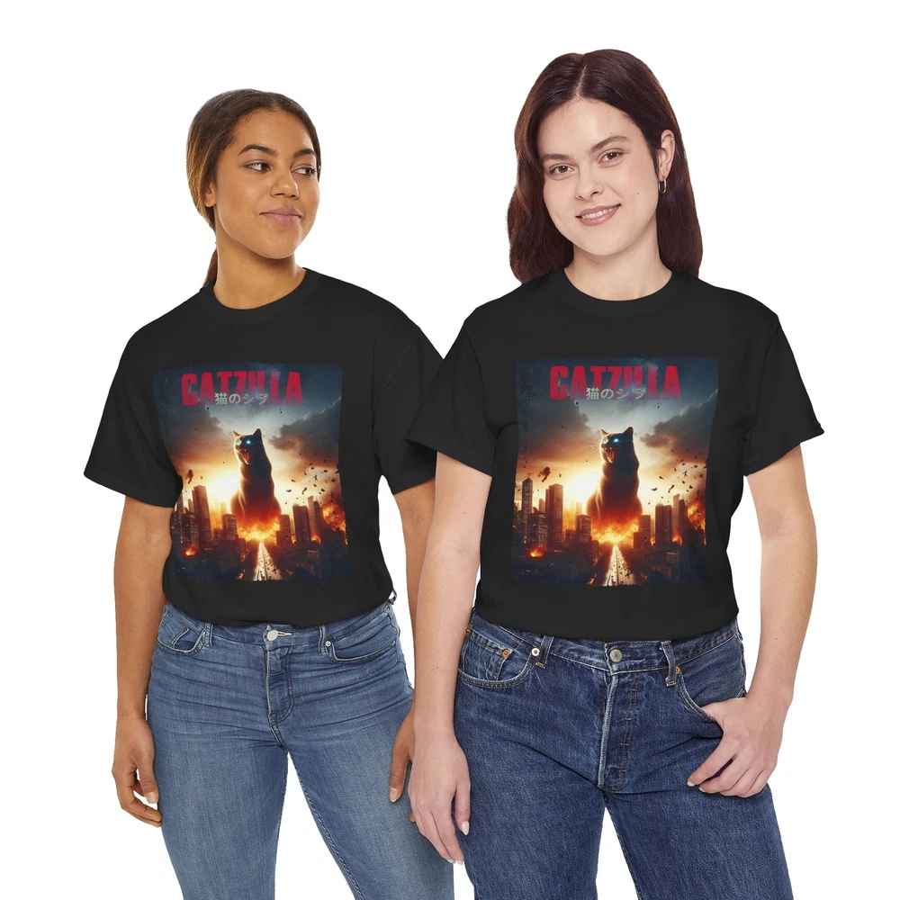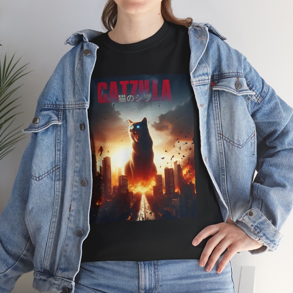 IMPERIAL S M L XL 2XL 3XL 4XL 5XL Width, in 18.00 20.00 22.00 24.00 26.00 28.00 30.00 32.00 Length, in 28.00 29.00 30.00 31.00 32.00 33.00 34.00 35.00 Sleeve length (from center back), in 15.10 16.50 18.00 19.50 21.00 22.40 23.70 25.00 Size tolerance, in 1.50 1.50 1.50 1.50 1.50 1.50 1.50 1.50 ------------------------------------------------------------------------------------------------------------------------------------------------------------------------------ METRIC S M L XL 2XL 3XL 4XL 5XL Width, cm 45.72 50.80 55.88 60.96 66.04 71.12 76.20 81.28 Length, cm 71.12 73.66 76.20 78.74 81.28 83.82 86.36 88.90 Sleeve length (from center back), cm 38.35 41.91 45.72 49.53 53.34 56.90 60.20 63.50 Size tolerance, cm 3.81 3.81 3.81 3.81 3.81 3.81 3.81 3.81 ----------------------------------------------------------------------------------------------------------------------------------------------------------------------------- Unleash feline chaos in style with our Catzilla T-Shirt , the ultimate tee for cat lovers who adore epic, funny, and monster-sized designs. Whether you're a fan of urban legends, Japanese kaiju culture, or just love a sassy cat with a giant attitude, this shirt is made for you. Crafted from 100% ethically grown U.S. cotton, this tee offers a durable yet soft medium-weight fabric (5.3 oz/yd² / 180 g/m²) that feels great on the skin and lasts wear after wear. Its classic fit ensures all-day comfort, while the crew neckline delivers a clean, timeless look perfect for both casual hangouts and relaxed weekends. Designed for cat lovers , kaiju fans , and anyone who enjoys bold, funny, and creative graphic tees, this shirt is more than just a novelty ? it's a wardrobe essential. The tear-away label guarantees a scratch-free experience with no irritation, and its Oeko-Tex certification means it's been tested for harmful substances, ensuring safety and peace of mind. Whether you're buying it for yourself or as a gift for a fellow cat fan, our Catzilla tee brings comfort, laughs, and style together in one perfect package. The unisex heavy cotton tee is the basic staple of any wardrobe. It is the foundation upon which casual fashion grows. All it needs is a personalized design to elevate things to profitability. The specially spun fibers provide a smooth surface for premium printing vividity and sharpness. No side seams mean there are no itchy interruptions under the arms. The shoulders have tape for improved durability. .: Made with medium fabric (5.3 oz/yd² (180 g/m²)) consisting of 100% cotton for year-round comfort that is sustainable and highly durable. .: The classic fit of this shirt ensures a comfy, relaxed wear while the crew neckline adds that neat, timeless look that can blend into any occasion, casual or semi-formal. .: The tear-away label means a scratch-free experience with no irritation or discomfort whatsoever. .: Made using 100% US cotton that is ethically grown and harvested. Gildan is also a proud member of the US Cotton Trust Protocol ensuring ethical and sustainable means of production. This blank tee is certified by Oeko-Tex for safety and quality assurance. The classic fit ensures a comfy, relaxed wear, while the crew neckline adds a neat, timeless look suitable for any occasion, casual or semi-formal. The tear-away label provide a scratch-free experience, ensuring no irritation or discomfort. Key Features: - **Shoulder Tape**: Twill tape covers the shoulder seams to stabilize the back of the garment and prevent stretching. - **No Side Seams**: Knitted in one piece using tubular knit, reducing fabric waste and making the garment more attractive. - **Ribbed Knit Collar**: Highly elastic ribbed knit collar helps retain its shape. - **Durable Fabric**: Specially spun fibers create a smooth surface for premium printing vividity and sharpness. Care Instructions: - Machine wash: warm (max 40C or 105F) - Non-chlorine bleach as needed - Tumble dry: medium - Do not iron - Do not dry clean This unisex heavy cotton tee is the foundation of casual fashion, providing a smooth surface for vibrant and sharp prints. Made from ethically grown and harvested cotton. EU representative : Invicticonte LLC, 2105 Vista Oeste St NW Suite E 1187, Albuquerque, NM, 87120, US Product information : Gildan 5000, 2 year warranty in EU and Northern Ireland as per Directive 1999/44/EC Warnings, Hazard : For adults, Made in Nicaragua Care instructions : Machine wash: warm (max 40C or 105F), Non-chlorine: bleach as needed, Tumble dry: medium, Do not iron, Do not dryclean Keywords: catzilla t-shirt, funny cat shirt, kaiju cat tee, cat graphic t-shirt, monster cat shirt, cat lovers gift, Japanese inspired shirt, cotton t-shirt USA, giant cat tee, urban cat design