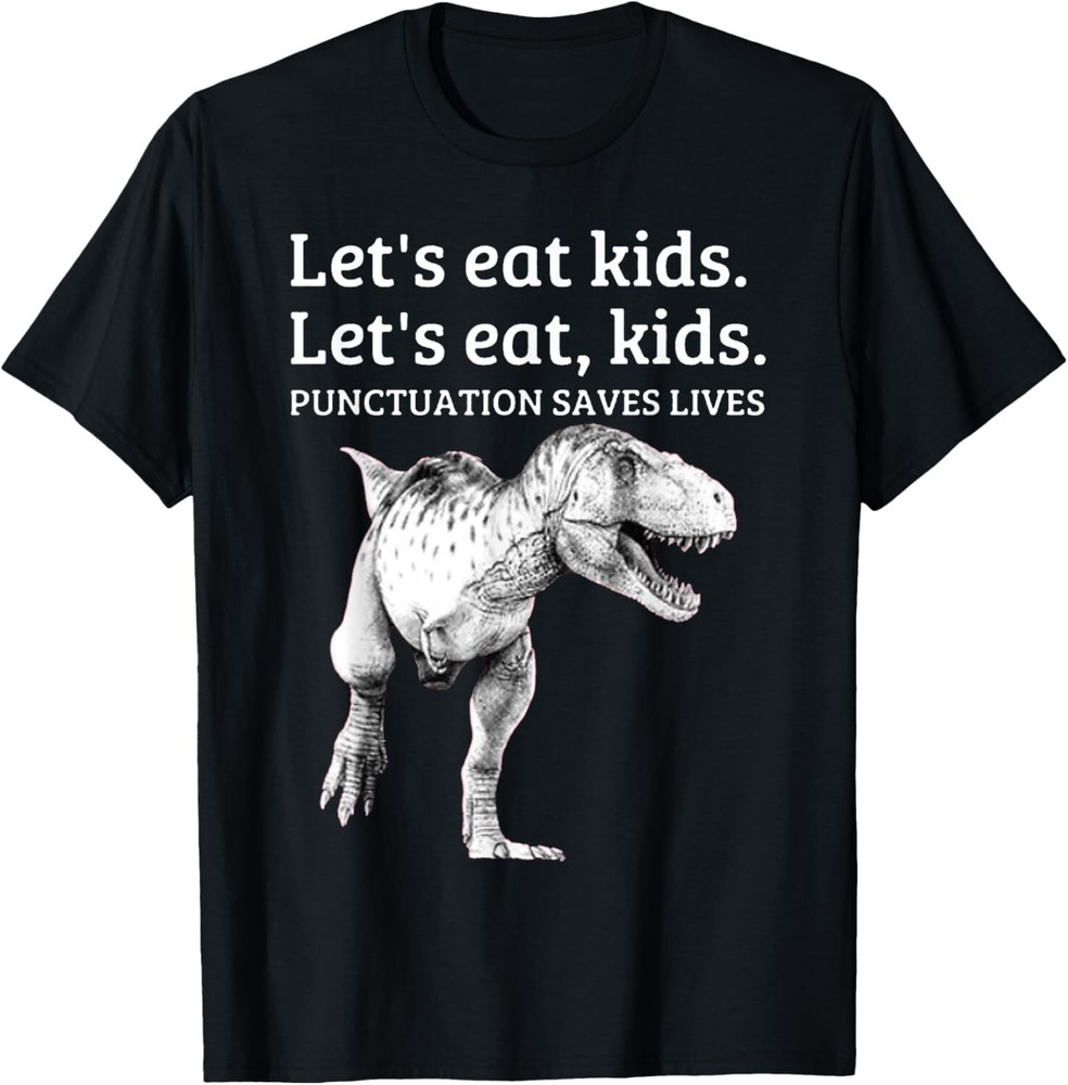 Funny Let's Eat Kids Punctuation Saves Lives Grammar T Shirt T-Shirt FREE SHIPPING! FAST DELIVERY! DOMESTIC SHIPPING! Delivery from 3 to 7 business days! Features and further details Stay classy and unique with custom cotton and a pretty thick t-shirt. The print on demand t-shirt is designed with a crew neckline, short sleeves for better comfort, taped neck and shoulders, and double-needle sleeves for enhanced durability. It?s a good choice for both men and women. Material: 5.3 oz/yd², Dark Heather, Graphite Heather, Heather Navy, Heather Red, Tweed (50% cotton, 50% polyester); Sport Grey, Antique Irish Green, Antique Orange, Antique Sapphire (90% Cotton/10% polyester), Ash (99% Cotton/ 1% Polyester), All Others (100% cotton). Classic, unisex fit - Comfortable to wear and suitable for anyone to wear. Non-stitched, classic width, rib collar. Printing technique: Direct to Garment. Color: Ash, Black, Charcoal, Dark Chocolate, Dark Heather, Forest Green, Gold, Ice Grey, Irish Green, Kiwi, Light Blue, Light Pink, Maroon, Military Green, Navy, Orange, Purple, Red, Royal, Sand, Sport Grey, Tropical Blue, Turf Green, White, Antique Irish Green, Antique Orange, Antique Sapphire, Azalea, Cardinal Red, Carolina Blue, Cobalt, Coral Silk, Cornsilk, Daisy, Graphite Heather, Heather Navy, Heather Red, Heliconia, Lime, Natural, Sapphire, Tweed. Size: S, M, L, XL, 2XL, 3XL, 4XL, 5XL. Blank product: Gildan 5000 Shipping We shipping from US for all orders! We offer FREE shipping on all orders! We ship within Three business days of payment, usually sooner. We use a selection of shipping services such as UPS, FedEx, USPS etc. We only ship to the lower 48 states, no APO/FPO addresses or PO Boxes allowed. Local pickups and combined shipping options are not provided at this time. Feedback Customer satisfaction is very important to us. If you have any problem with your order, please contact us and we will do our best to make you satisfied. Contact Us If you have any queries, please contact us via ebay. We usually respond within 24 hours on weekdays. Please visit our store to check out other items for sale! Thank you for shopping at our store.