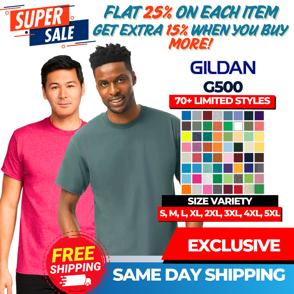 GD210 Gildan G500 Mens Classic Heavy Cotton Short Sleeve T-Shirt – Premium Printable Quality, Ultra Comfortable, Durable & Perfect for Casual Wear Or Layering Product Specifications: 5.3 oz., 100% US cotton, 20/1 5.3 oz., 99% cotton / 1% polyester (Ash Grey) 5.3 oz., 90% cotton / 10% polyester (Sport Grey & Antique Colors) 5.3 oz., 50% cotton / 50% polyester (Blackberry, Heather Colors, Lilac, Midnight, Neon Colors, Russet, Sunset, Tweed, Safety Pink, S Orange & Safety Green) Heavy Cotton offers an extensive color palette across a variety of silhouettes. Classic width, rib collar Taped neck and shoulders for comfort and durability Classic fit, seamless body Transitioning to high-performing black recycled tear-away label Safety Green is compliant with ANSI / ISEA 107 high-visibility standards Proud member of the U.S. Cotton Trust Protocol Made with OEKO-TEX certified low-impact dyes Plastic waste is diverted from landfills annually by the removal of polybags from all products except color white Size Chart: Colors Available: Antique Cherry Red Antique Irish Green Antique Jade Dome Antique Orange Antique Sapphire Aquatic Ash Azalea Berry Black Blackberry Blue Dusk Brown Savana Cardinal Carolina Blue Charcoal Cobalt Coral Silk Cornsilk Daisy Dark Chocolate Dark Heather Dusty Rose Electric Green Forest Garnet Gold Graphite Heather Gravel Heather Military Green Heather Navy Heather Radiant Orchid Heather Red Heather Sapphire Heliconia Ice Grey Indigo Blue Irish Green Kiwi Light Blue Light Pink Lilac Lime Maroon Midnight Military Green Mint Green Natural Navy Neon Blue Neon Green Off White Old Gold Orange Purple Red Royal Russet Safety Green Safety Pink Sand Sapphire Sky S Orange Sport Grey Sunset Tangerine Tennessee Orange T Orange Tropical Blue Turf Green Tweed Violet White Yellowhaze