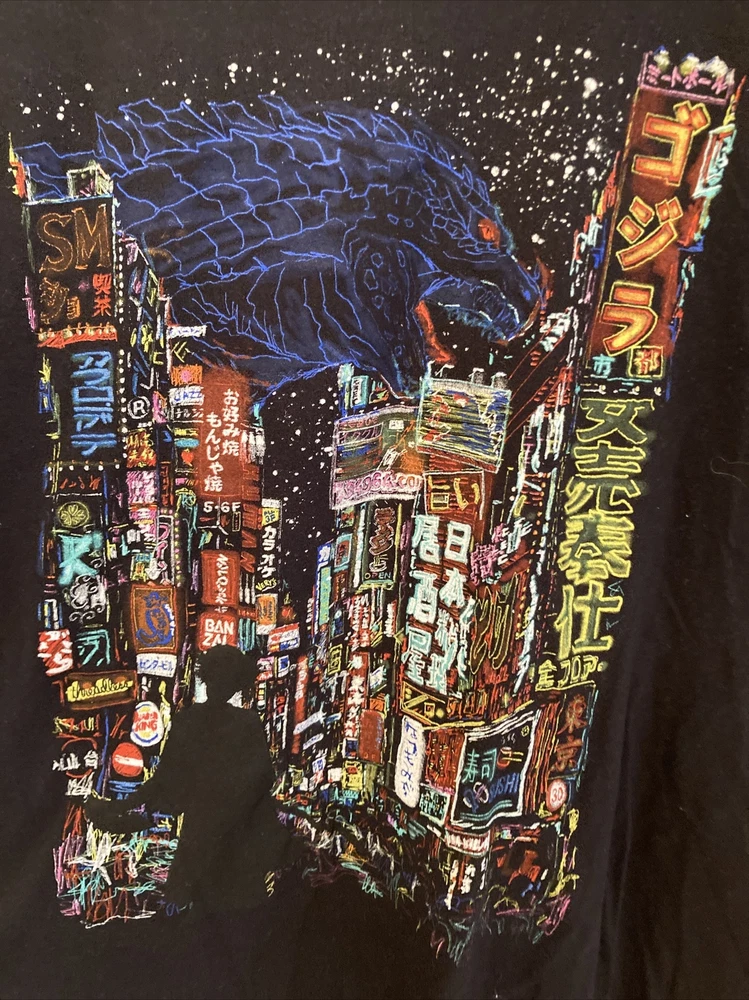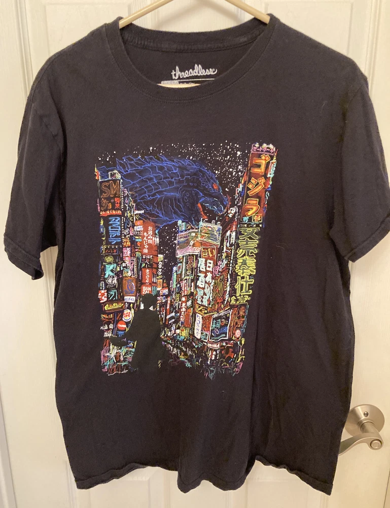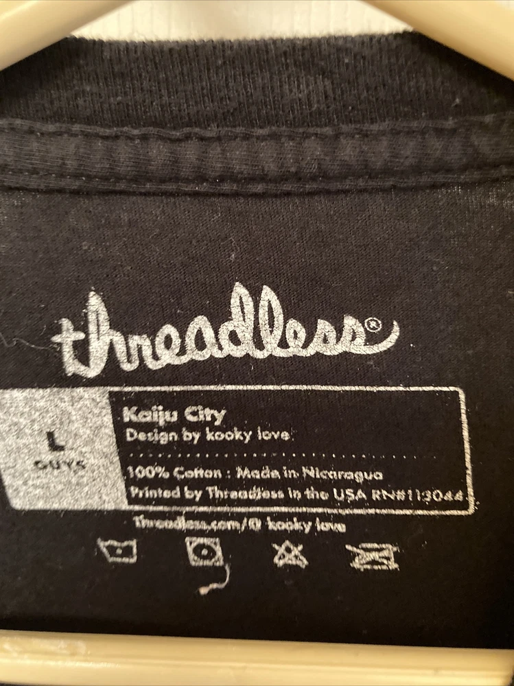 Measures 21 inches from armpit to armpit and 26 inches from top to bottom GODZILLA KAIJU CITY Mens Threadless Rare T-Shirt Sz Med Black Kooky Love Design.