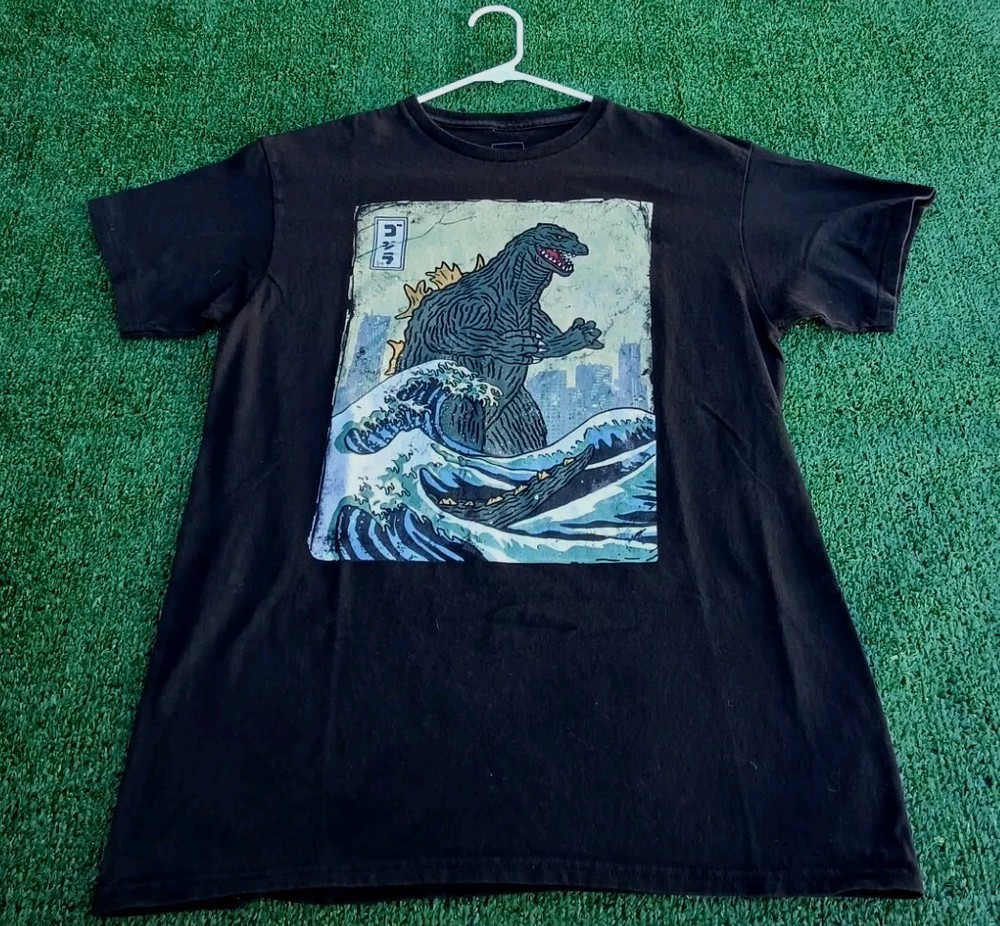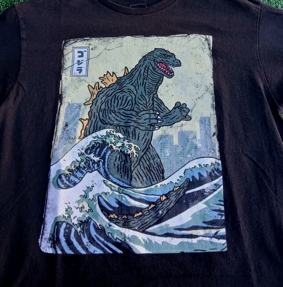 Embrace your love for the iconic monster with this GODZILLA Kanagawa Wave Graphic T-Shirt. Made for fans of the legendary creature, this black cotton tee features a striking graphic print that captures the essence of Godzilla. The crew neck and short sleeves offer a comfortable fit, perfect for everyday wear. Available in men's size medium, this regular-fit shirt is crafted for all-season comfort. It's easy to care for – machine washable – and boasts a knit fabric that ensures durability. Whether you're out for a casual movie-themed day or just looking to add some character to your wardrobe, this T-shirt is an excellent choice.