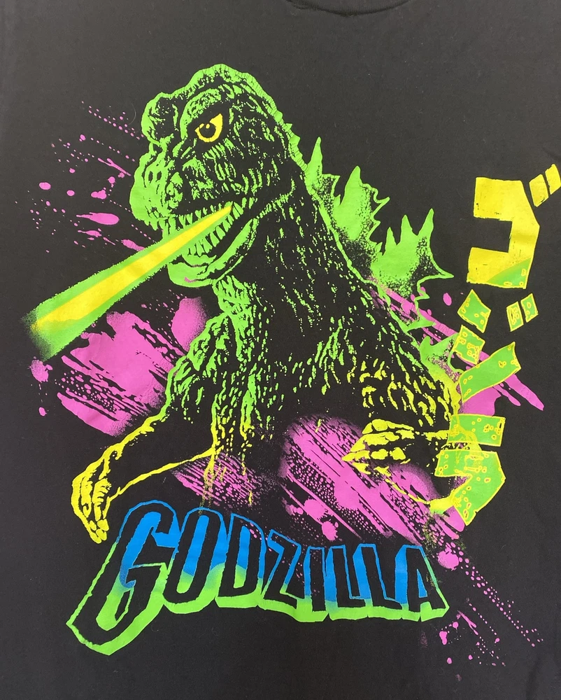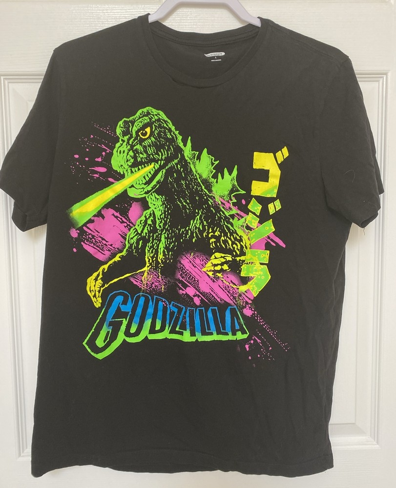 This product is a pre-owned Godzilla Retro Monster Movie T-Shirt made of cotton with a round neckline and short sleeves. It features a graphic print of the movie logo and the character Godzilla. The shirt is in size L and has an athletic fit. It is tagless and machine washable. The design is a retro reprint of the classic Japanese monster movie. The shirt is part of the Godzilla product line by Old Navy and is perfect for fans of the classic monster movie.