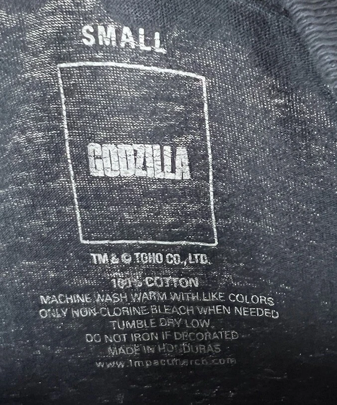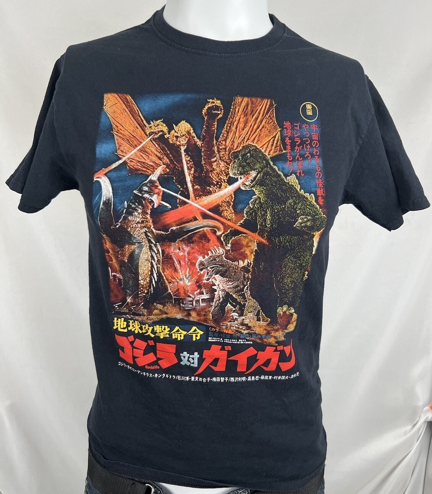 Show off your love for Godzilla with this stylish black t-shirt featuring a solid pattern and short sleeves. The crew neck and regular fit make it comfortable to wear for any occasion. This shirt is perfect for fans of the Godzilla franchise and features the iconic character in a fierce battle against King Ghidorah and Anguirius. The shirt is machine washable and made from high-quality knit fabric, ensuring durability and long-lasting wear. Get your hands on this Japanese size small t-shirt and add it to your collection today! Very nice condition FREE SHIPPING