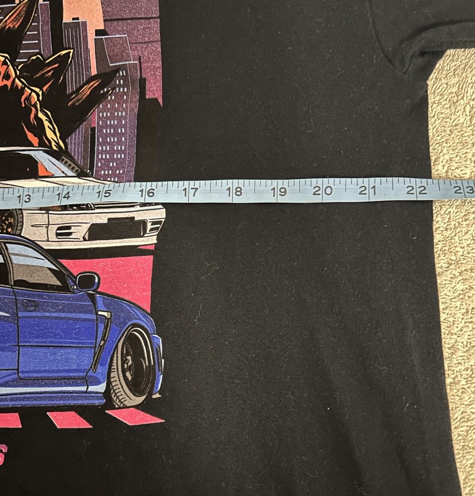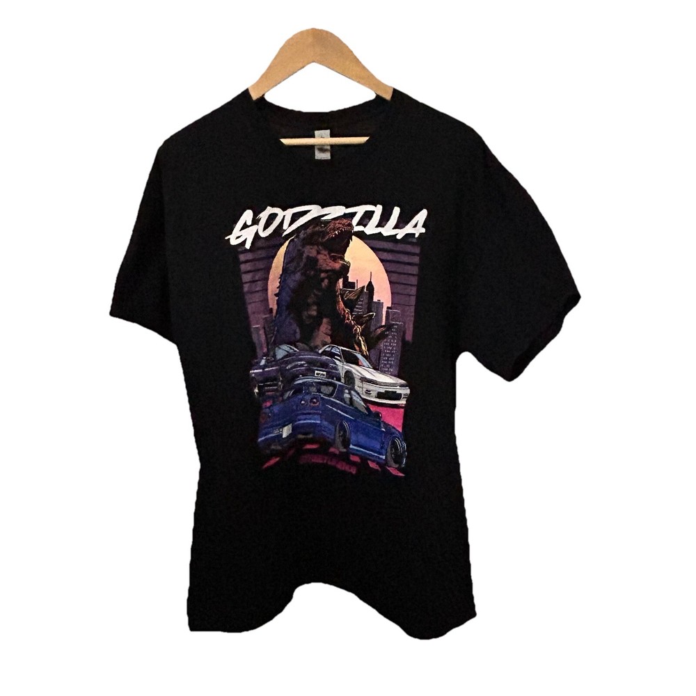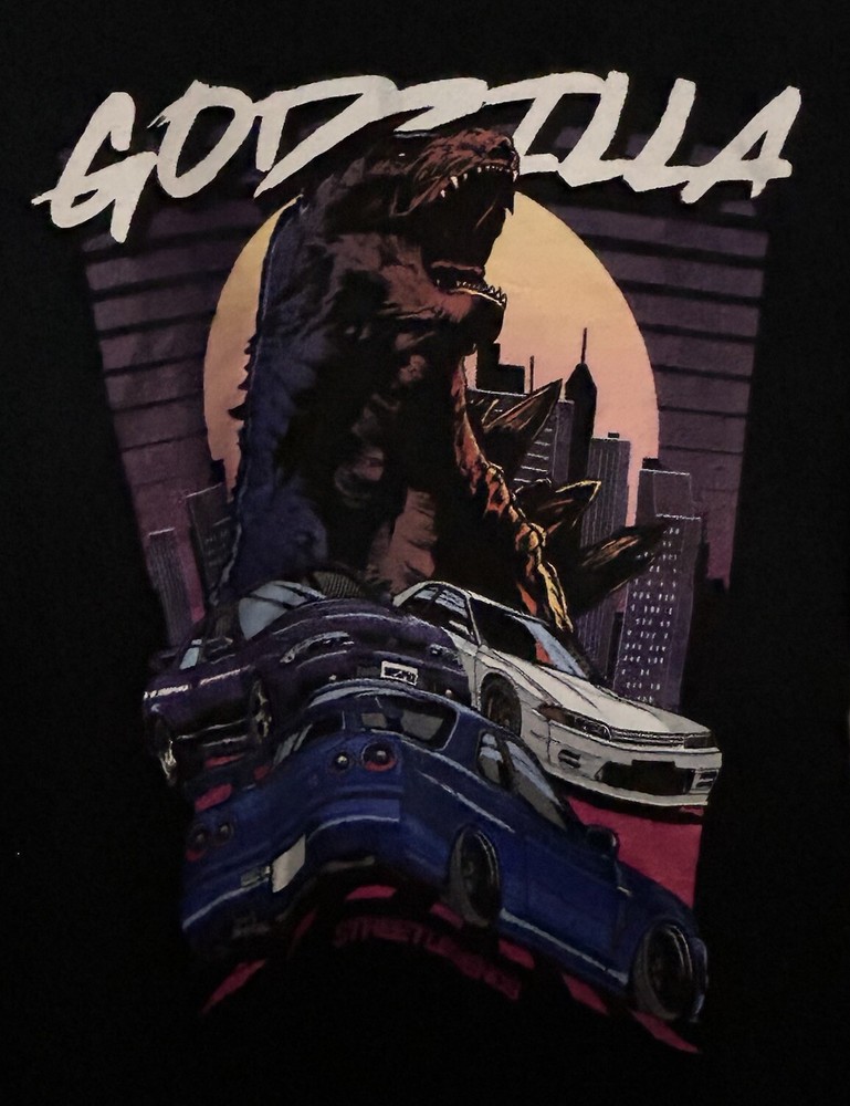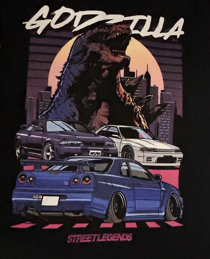Godzilla and Three Nissan Skyline GT-R cars design, inspired by Japanese Domestic Market culture. The shirt is in black with short sleeves and a regular fit. The theme of the shirt includes cars, movies, Godzilla, anime, and the 80s and 90s eras. Perfect for fans of Godzilla and JDM enthusiasts. 00130