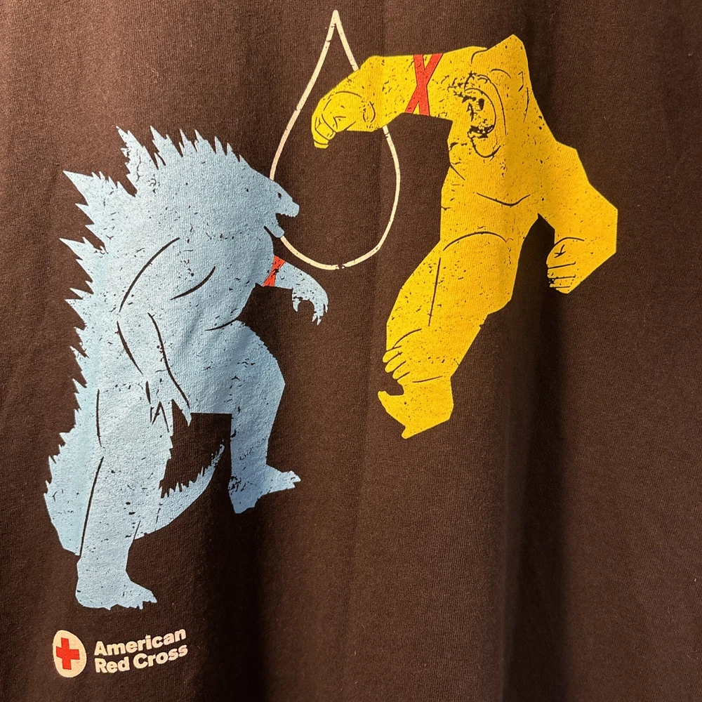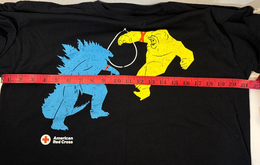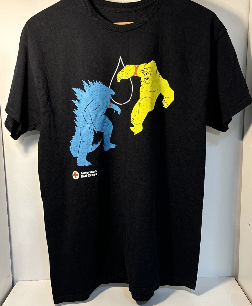 Show your love for the epic battle between two monster icons with this limited edition Godzilla x King Kong New Empire American Red Cross Movie Promo T-Shirt. Made by Gildan, this regular fit t-shirt is perfect for any unisex adult fan of the movie theme. The black color and size L make it a stylish addition to any wardrobe. The t-shirt features the iconic characters Godzilla and King Kong, making it a must-have for any fan of the franchise. The shirt was manufactured between 2020-2029, ensuring its relevance to the current market. Get your hands on this unique piece of merchandise before it's gone. Tag is missing is a large pit to pit 21” length is 29.5”