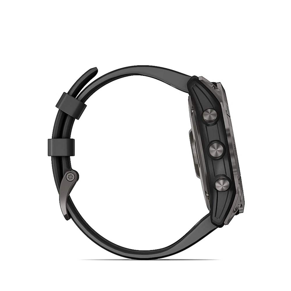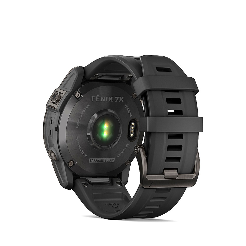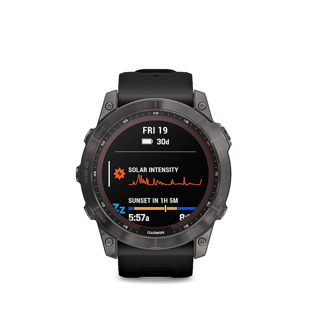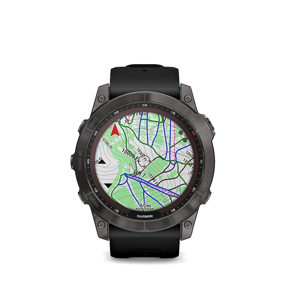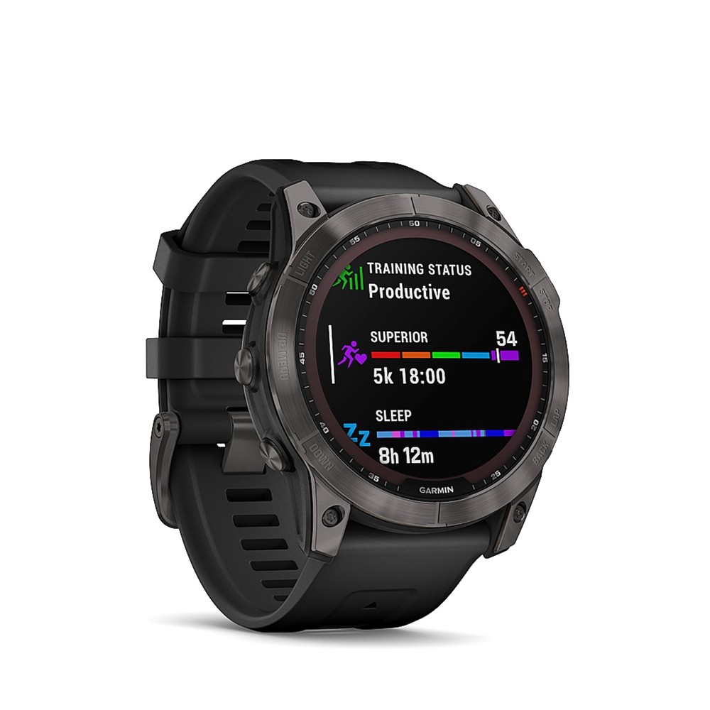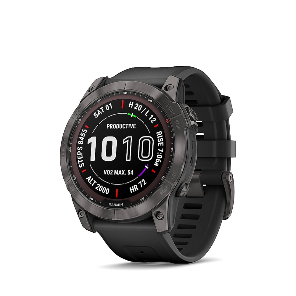 Garmin Fēnix 7X Sapphire Solar GPS Smartwatch Fiber reinforced polymer Carbon Gray There are 7 days in a week. And the fēnix 7X Sapphire Solar multisport GPS watch is built to go strong for all of them. Featuring a big 1.4” display, built-in LED flashlight and Power Sapphire solar charging lens, it has the long-lasting battery life to sustain your athletic and outdoor challenges. Use trusted button controls or the new touchscreen interface to access selections. Gain performance insights and metrics that help you manage your exertion and build stamina. Optimize recovery with 24/7 health and wellness monitoring of heart rate, respiration, stress, sleep and more this device is intended to give an estimation of your activity and metrics; it is not a medical device). Outdoor navigation sensors and new multi-band GNSS technology help guide you with a higher level of positioning accuracy, even in challenging environments. Plus, you’ll have preloaded TopoActive maps and worldwide ski and golf maps right on your wrist. To complement your tamer days, connected features include smart notifications when connected to a compatible smartphone, music storage and Garmin Pay contactless payments in supported countries and payment networks Features Performance by design Long-running solar powered multisport GPS watch with scratch-resistant Power Sapphire lens and always-on 1.4” display uses the sun’s energy to extend battery life; a built-in LED flashlight keeps you going after dark Battery Up to 28 days of battery life while indoors or up to 37 days when solar charging (assuming all-day wear with 3 hours per day outside in 50,000 lux condition) in smartwatch mode; in GPS mode, up to 89 hours indoors or up to 122 hours when solar charging (assuming use in 50,000 lux conditions) Touchscreen and buttons Trusted button controls that work in any environment are matched with a highly responsive touchscreen interface for quick, convenient access to selections Health montioring activity Get 24/7 health and wellness monitoring with wrist-based heart rate, Pulse Ox (not available in all countries), stress and enhanced sleep tracking (this device is intended to give an estimation of your activity and metrics; it is not a medical device). Multi-bane GNSS support and ABC sensors Navigate the outdoors with built-in sensors for the 3-axis compass, gyroscope and barometric altimeter; supports multi-GNSS satellite systems (GPS, GLONASS and Galileo) Mulicontinent topo maps Find freedom and adventure with preloaded TopoActive maps — plus maps for thousands of golf courses and ski resorts worldwide. Built-in Wi-Fi connectivity lets you download maps for any continent at any time — without using a computer Smart notifications Enjoy everyday lifestyle connectivity features, including smart notifications when connected to a compatible smartphone, music storage and our Garmin Pay contactless payment solution in supported countries and payment networks Screen Size 36 millimeters Touch Screen Yes Operating System Compatibility Android, Apple iOS Operating System Garmin App Compatible Yes Global Positioning GPS, GLONASS, Galileo Metrics Measured Activity vs. inactivity, Altitude changes, Blood oxygen, Breathing patterns, Cadence, Calories burned, Cycling speed, Distance swam, Distance traveled, Duration of exercise, Heart rate, Hours slept, Laps swam, Pace, Sleep quality, Speed, Stairs climbed, Steps taken, Temperature Water Resistant Yes Maximum Depth of Water Resistance 328 feet Band Material Silicone Series fenix 7X General Product Name fēnix 7X Sapphire Solar GPS Smartwatch 51 mm Fiber-reinforced polymer Brand Garmin Product Type Smartwatch Form Factor Wristwatch Model Family Garmin fenix 7X Model Number 010-02541-10 Series fenix 7X Color Carbon Gray DLC Titanium Color Category Gray Design Case Size 51mm Case Shape Circular Band Color Black Display Display Screen Yes Screen Size 36 millimeters Touch Screen Yes Screen Resolution 280 x 280 Display Type MIP LCD Color Display Yes Clock Display Yes Backlit Display Yes Adjustable Brightness Yes Customizable Watch Faces Yes Screen Material Power Sapphire Compatibility Operating System Compatibility Android, Apple iOS Operating System Garmin App Compatible Yes Connectivity Data Plan Required No Internal Carrier Not Applicable Bluetooth Enabled Yes NFC Technology Yes Wi-Fi Compatibility Wireless N Features Global Positioning GPS, GLONASS, Galileo Mobile Notifications Yes Alert Type Audible, Vibration, Visual Mobile Payment Service Supported Garmin Pay Music Player Yes Vibration Alert Yes Activity Metrics Measured Activity vs. inactivity, Altitude changes, Blood oxygen, Breathing patterns, Cadence, Calories burned, Cycling speed, Distance swam, Distance traveled, Duration of exercise, Heart rate, Hours slept, Laps swam, Pace, Sleep quality, Speed, Stairs climbed, Steps taken, Temperature Multi-Sport Tracking Yes Sensors Accelerometer, Altimeter, Barometer, Compass, Gyro sensor, Heart rate sensor, Pulse oximeter (Sp02) sensor, Temperature sensor Medical Incident Notification Contact text, Email Medical Incidents Detected Fall Performance Water Resistant Yes Maximum Depth of Water Resistance 328 feet Power Rechargeable Yes Battery Strength Indicator Yes Charging Interface(s) USB, Solar Material Band Material Silicone Case Material Polymer Dimension Maximum Wrist Size 8.2 inches Band Size Adjustable Product Height 2 inches Product Width 2 inches Product Depth 0.58 inches Product Weight 3.13 ounces