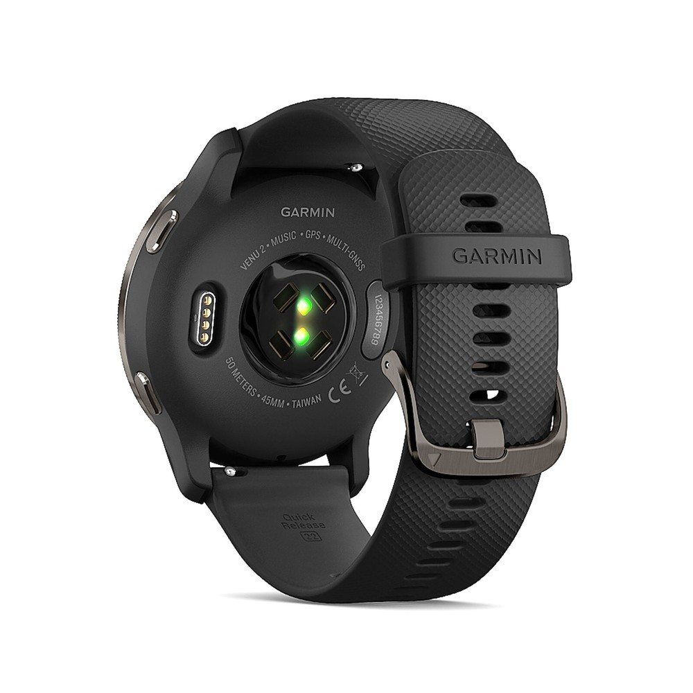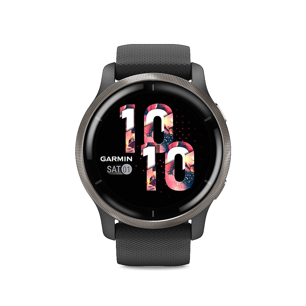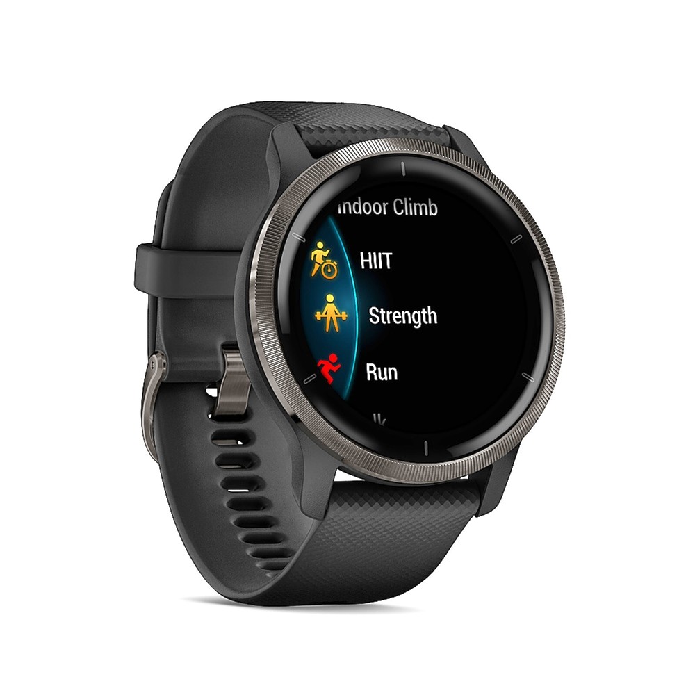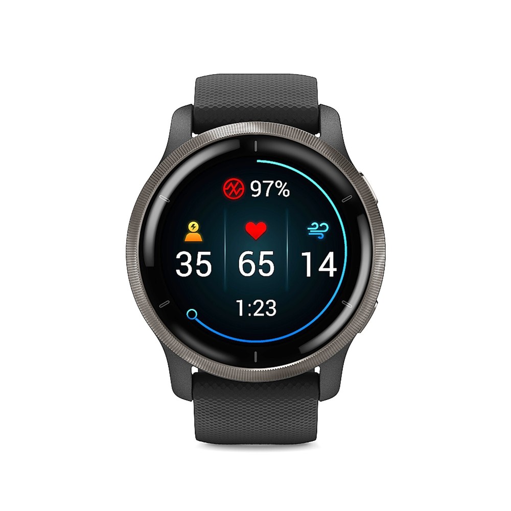 Garmin Venu 2 GPS Smartwatch 45 mm Fiber-Reinforced Polymer Slate Bezel with Black Case W hen you live healthy, you live better. Get in tune with your mind and body with Venu® 2. This GPS smartwatch has advanced health monitoring and fitness features to help you better understand what’s going on inside your body. It feels good to move. Switch up your activities with animated workouts and more than 25 built-in indoor and GPS sports apps. Feed your soul with your favorite music, stored right on your wrist for phone-free listening when paired with wireless headphones (sold separately). And battery life up to 5 days with rapid recharging lets you get an uninterrupted picture of your health. This is what it’s all about. Mind and body — connected by Garmin. Features COMPATIBILITY Compatible with iPhone® and Android™ devices BATTERY LIFE WITH RAPID RECHARGING Get an uninterrupted picture of your health with up to 11 days in smartwatch mode, up to 22 hours in GPS mode and up to 8 hours in GPS mode with music. Ten minutes of charging adds up to 1 day of smartwatch mode battery life or 1 hour of GPS with music battery life. MADE FOR THE ACTIVE LIFESTYLE From durable Corning® Gorilla® Glass 3 to the sleek stainless steel bezel and comfortable silicone band, this smartwatch is ready for anything. HEALTH SNAPSHOT™ FEATURE *Log a 2-minute session to record key stats, including heart rate, heart rate variability, Pulse Ox, respiration and stress. Then generate a report with those stats via the Garmin Connect™ app on your compatible smartphone to share. BODY BATTERY™ ENERGY MONITORING See your body’s energy levels throughout the day so you can find the best times for activity and rest. PULSE OX SENSOR Use the Pulse Ox sensor to spot check your blood oxygen saturation at any point during the day, or for part of the night as you sleep, to show how well your body is absorbing oxygen. STRESS TRACKING Find out if you’re having a calm, balanced or stressful day. Relax reminders will even prompt you to do a short breathing activity when the watch detects that you’re feeling stressed WOMEN’S HEALTH TRACKING Use the Garmin Connect app to track your menstrual cycle or pregnancy. Log symptoms, get exercise and nutrition education and more. Even see and log details on your wrist with the Women’s Health Tracking app. SLEEP SCORE AND ADVANCED SLEEP MONITORING Get a score for your sleep’s quality and insights on how you can do better. Even keep track of the different sleep stages as well as heart rate, stress, Pulse Ox and respiration. BUILT-IN SPORTS APPS Track all the ways you move with more than 25 preloaded GPS and indoor sports apps — including walking, running, cycling, pool swimming, golf and more. HIIT WORKOUTS Use this new activity profile with different timers to track your HIIT workouts, including AMRAP, EMOM, Tabata and custom. Set the number of rounds, work/rest intervals and more. GARMIN PAY™ Breeze through checkout lines and select transit systems with Garmin Pay contactless payment solution1 through participating providers. DISPLAY A beautiful AMOLED display brings this watch to life, even under bright sunlight. Try always-on mode to keep the display visible at all times Disclaimer *This is not a medical device and is not intended for use in the diagnosis or monitoring of any medical condition; see Garmin.com/ataccuracy. Pulse Ox not available in all countries Screen Size 33 millimeters Touch Screen Yes Operating System Compatibility Android, Apple iOS Operating System Garmin App Compatible Yes Global Positioning GPS, GLONASS, Galileo Metrics Measured Activity vs. inactivity, Altitude changes, Blood oxygen, Cadence, Calories burned, Cycling speed, Distance swam, Distance traveled, Duration of exercise, Heart rate, Hours slept, Laps swam, Pace, Sleep quality, Speed, Stairs climbed, Steps taken Water Resistant Yes Maximum Depth of Water Resistance 164 feet Band Material Silicone Series Venu 2 General Product Name Venu 2 GPS Smartwatch 45 mm Fiber-Reinforced Polymer Brand Garmin Product Type Smartwatch Form Factor Wristwatch Model Family Garmin Venu 2 Model Number 010-02430-01 Series Venu 2 Color Slate Bezel with Black Case Color Category Black Design Case Size 45mm Case Shape Circular Band Color Black Clasp Type Hook buckle Rotating Bezel No Display Display Screen Yes Screen Size 33 millimeters Touch Screen Yes Display Type AMOLED Color Display Yes Clock Display Yes Backlit Display Yes Adjustable Brightness Yes Customizable Watch Faces Yes Screen Material Corning® Gorilla® Glass 3 Compatibility Operating System Compatibility Android, Apple iOS Operating System Garmin App Compatible Yes Connectivity Data Plan Required No Bluetooth Enabled Yes NFC Technology Yes Wi-Fi Compatibility Wireless N Features Global Positioning GPS, GLONASS, Galileo Mobile Notifications Yes Alert Type Audible, Vibration Mobile Payment Service Supported Garmin Pay Music Player Yes Vibration Alert Yes Activity Metrics Measured Activity vs. inactivity, Altitude changes, Blood oxygen, Cadence, Calories burned, Cycling speed, Distance swam, Distance traveled, Duration of exercise, Heart rate, Hours slept, Laps swam, Pace, Sleep quality, Speed, Stairs climbed, Steps taken Multi-Sport Tracking Yes Sensors Accelerometer, Altimeter, Ambient light sensor, Barometer, Compass, Gyro sensor, Heart rate sensor, Pulse oximeter (Sp02) sensor Performance Water Resistant Yes Maximum Depth of Water Resistance 164 feet Minimum Operating Temperature -4 degrees fahrenheit Maximum Operating Temperature 140 degrees fahrenheit Power Rechargeable Yes Battery Strength Indicator Yes Charging Interface(s) USB Material Band Material Silicone Case Material Polymer Dimension Minimum Wrist Size 5.3 inches Maximum Wrist Size 7.87 inches Product Weight 1.7 ounces